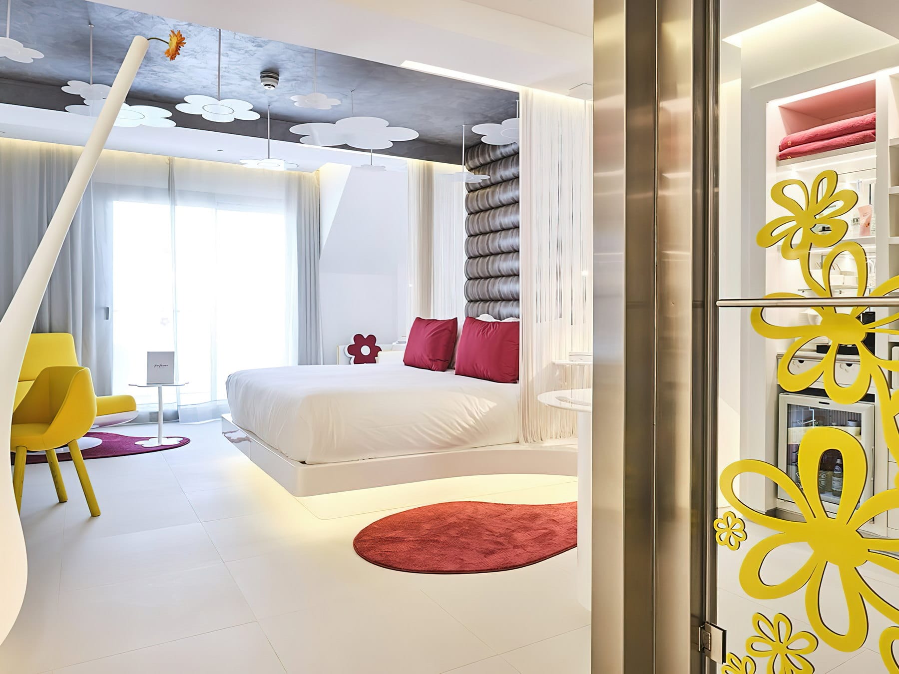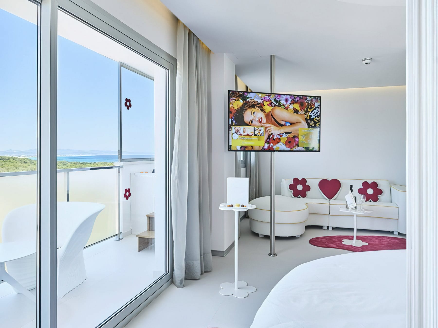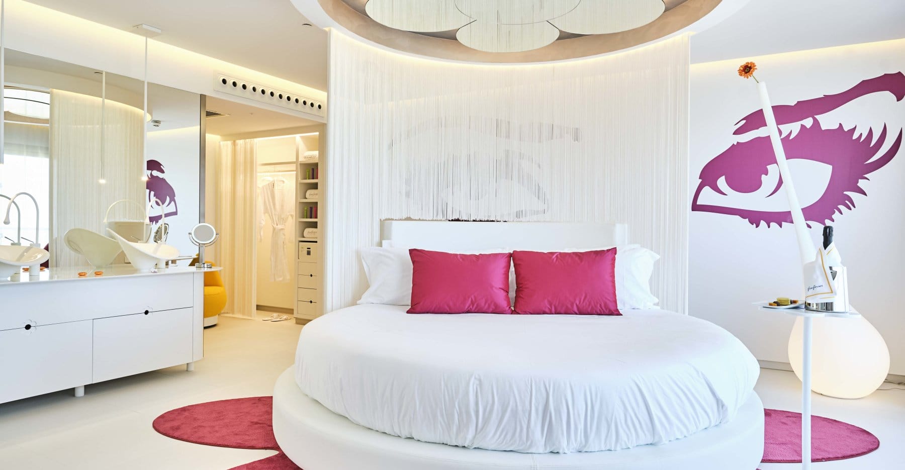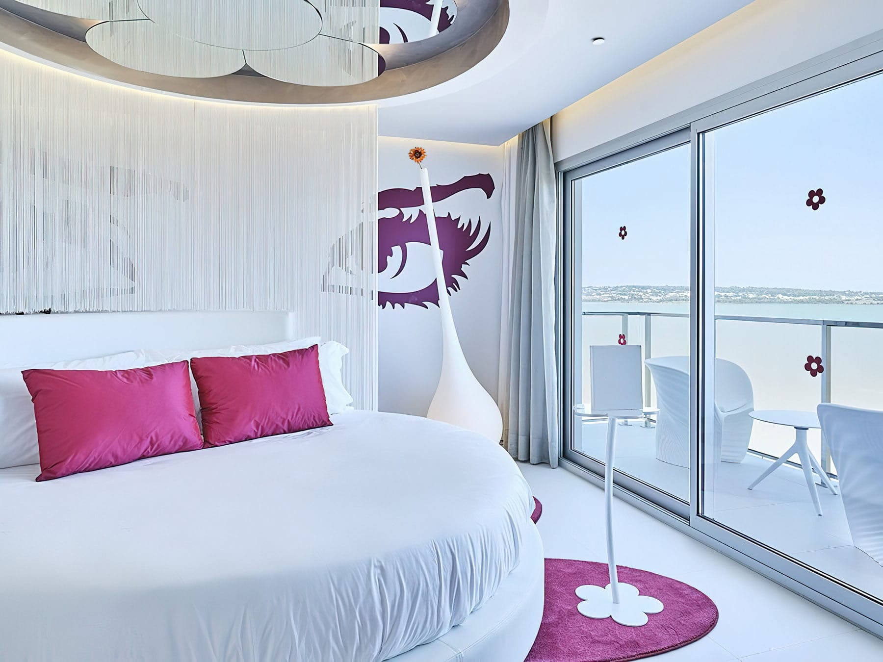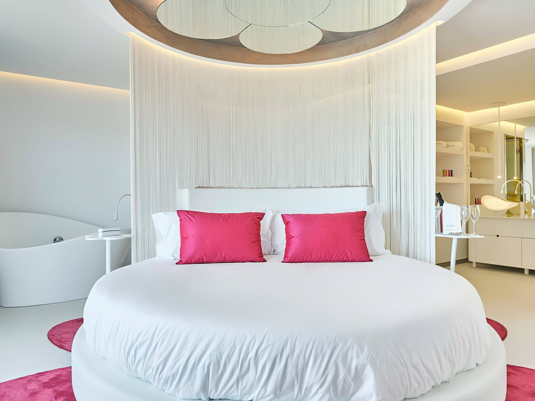 Suite : This large 37 m2 suite has spectacular views of the lake. It has a private whirlpool bath, a round bed with a 2.2m diameter and a sofa bed for an extra guest. The Flower Suite guests have access to “Free VIP Transfer” from and to the port of Formentera.
