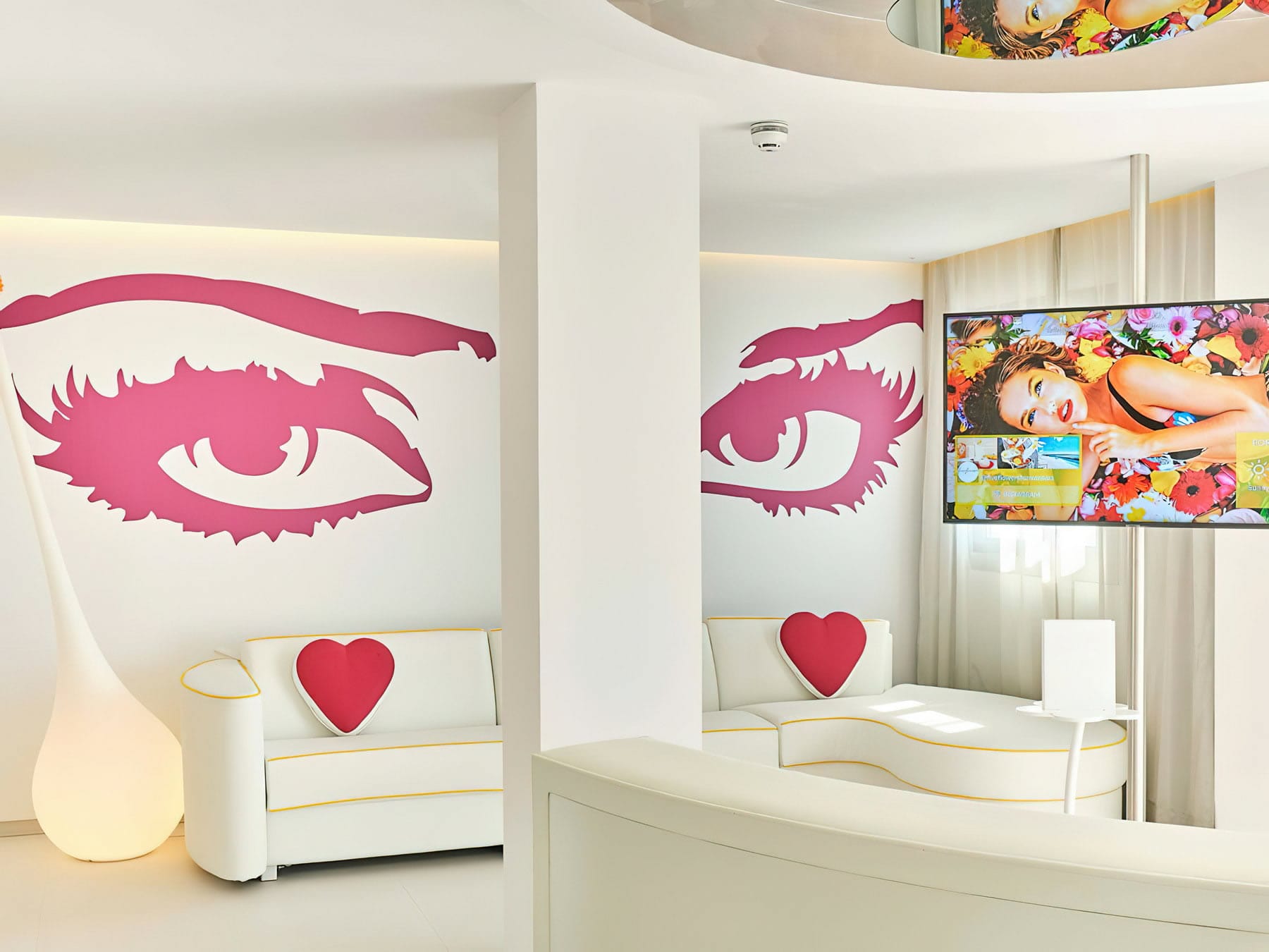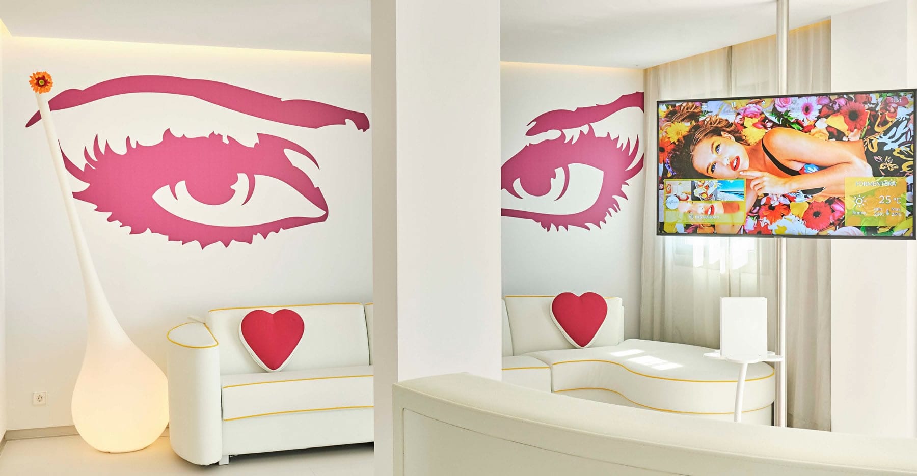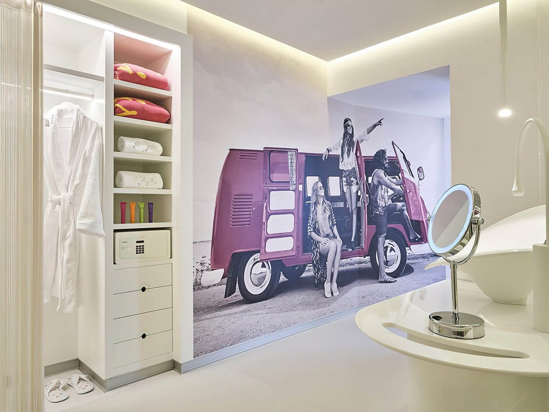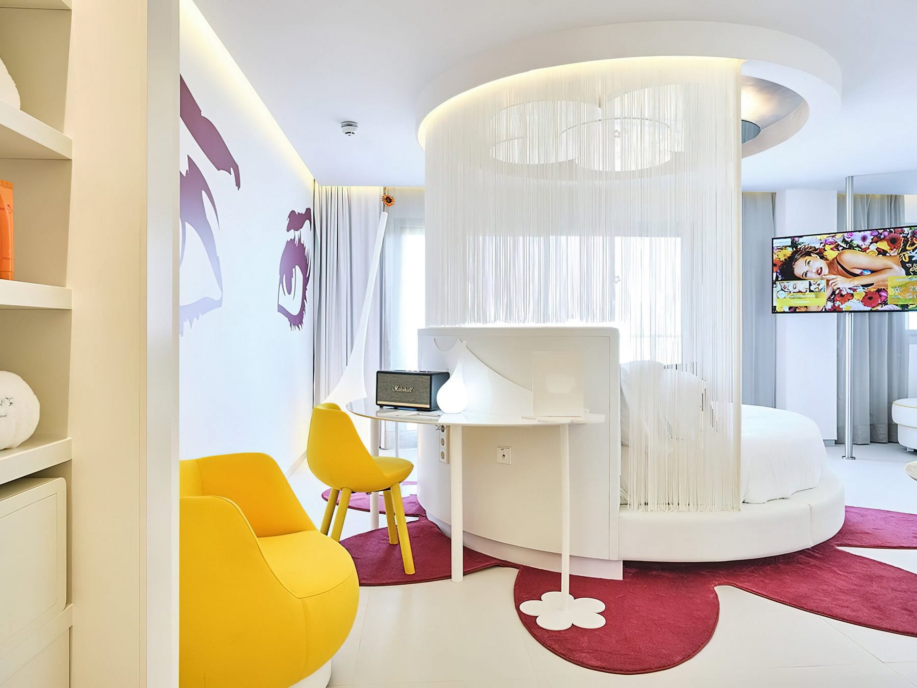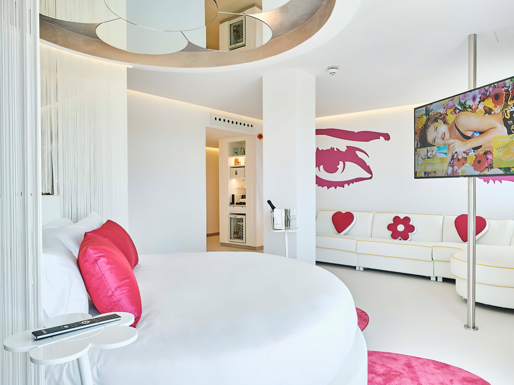 Suite : This large 37 m2 suite has spectacular views of the lake. It has a private whirlpool bath, a round bed with a 2.2m diameter and a sofa bed for an extra guest. The Flower Suite guests have access to “Free VIP Transfer” from and to the port of Formentera.