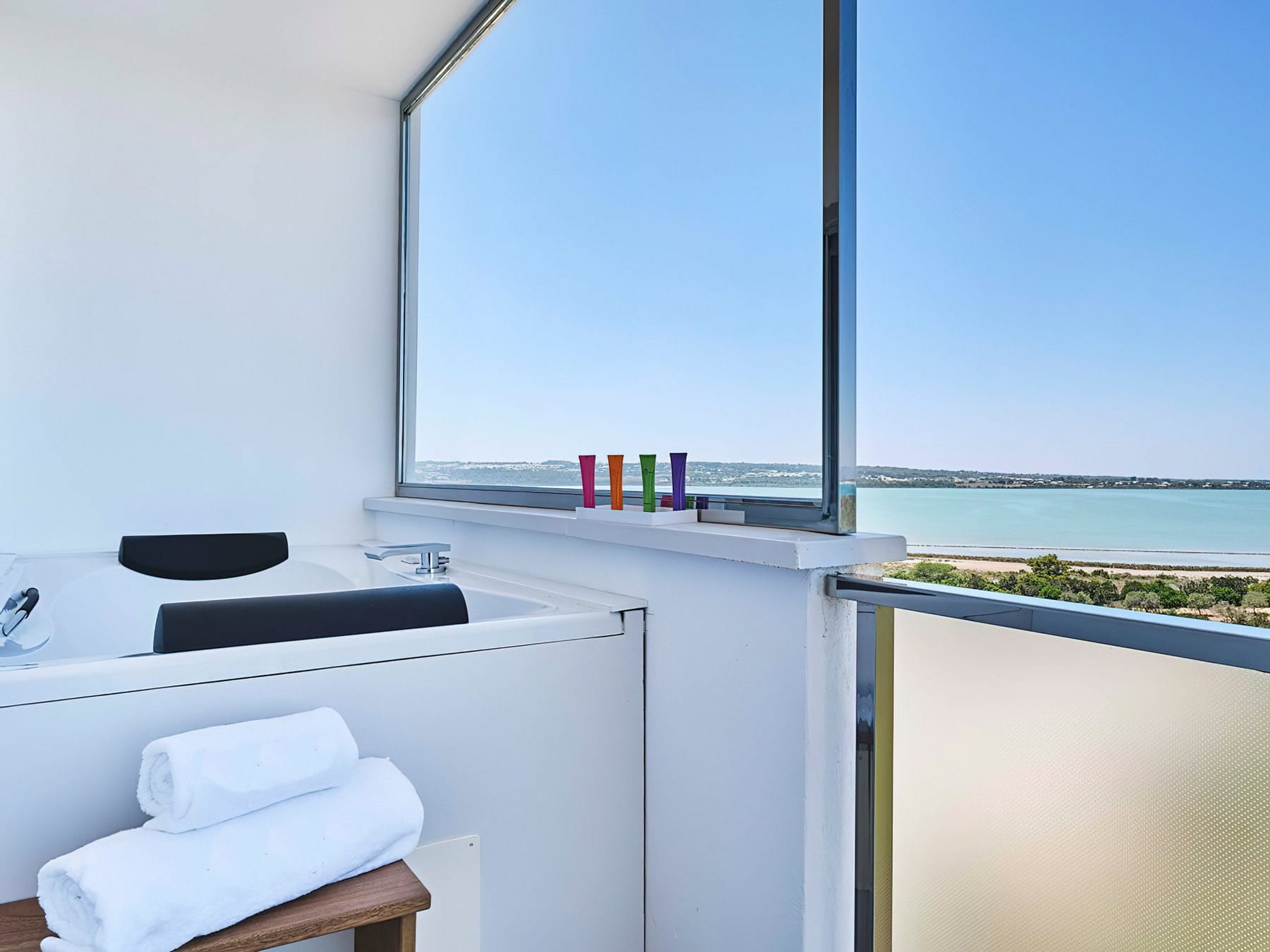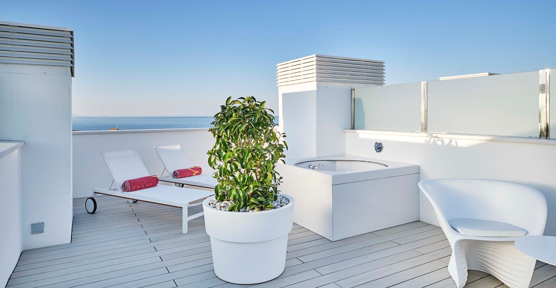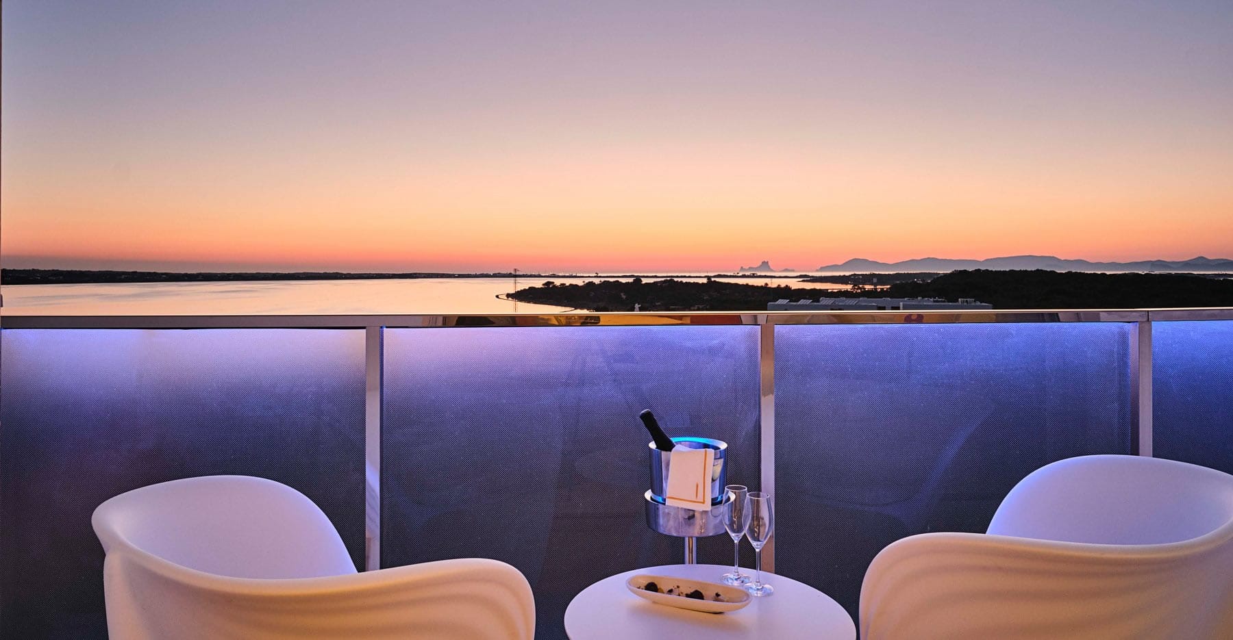 Top Suite: Is the hotel’s main guest room and measures 57m2. Its bed, with a 2.2m diameter, is oriented towards the lake and will offer you unmatched scenic awakenings and unforgettable sunsets. The room boasts an in-room bathtub, as well as a private whirlpool bath out on the terrace and a sofa bed for two extra guests. The Top Suite guests have access to “Free VIP Transfer” from and to the port of Formentera.