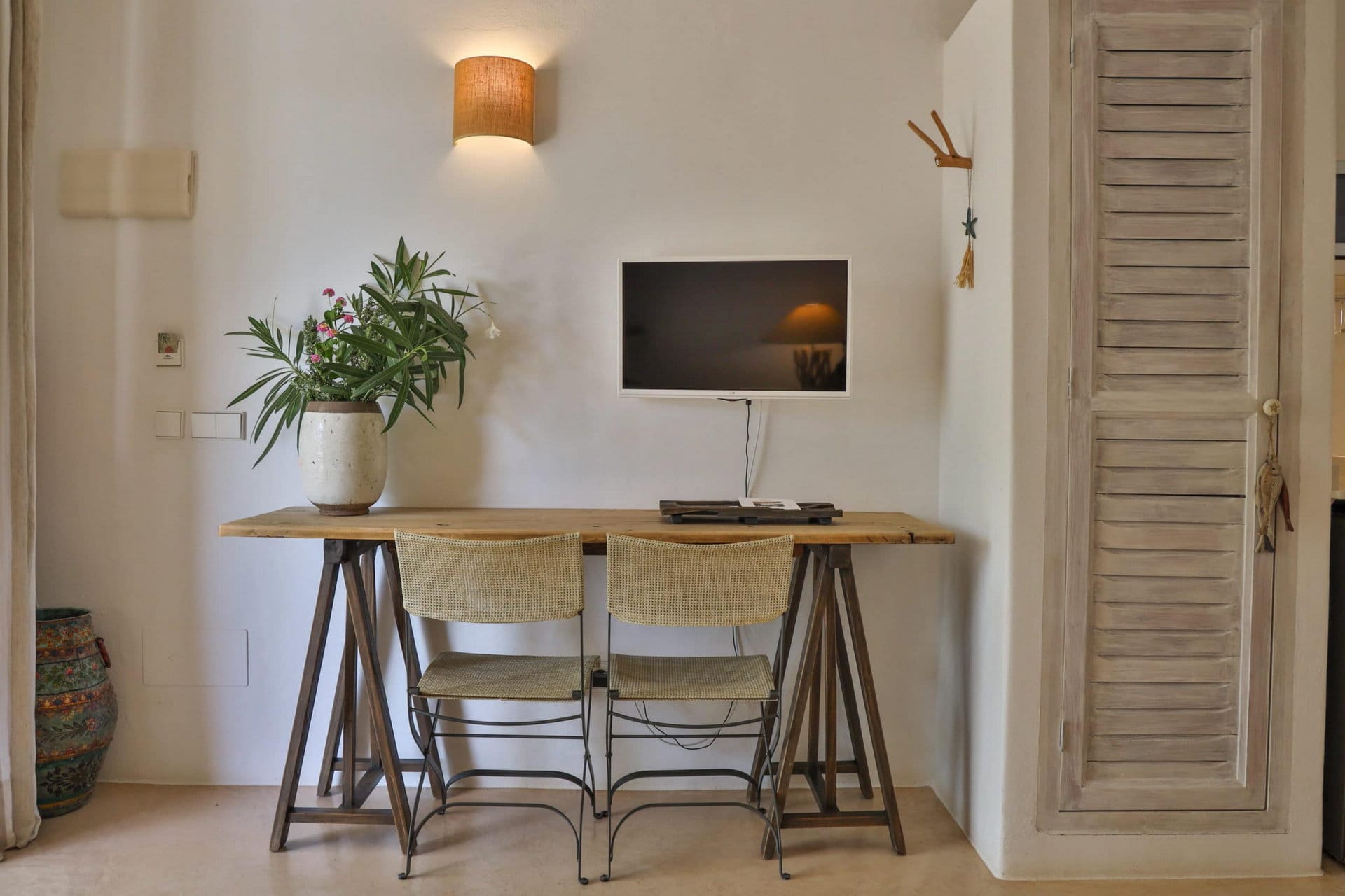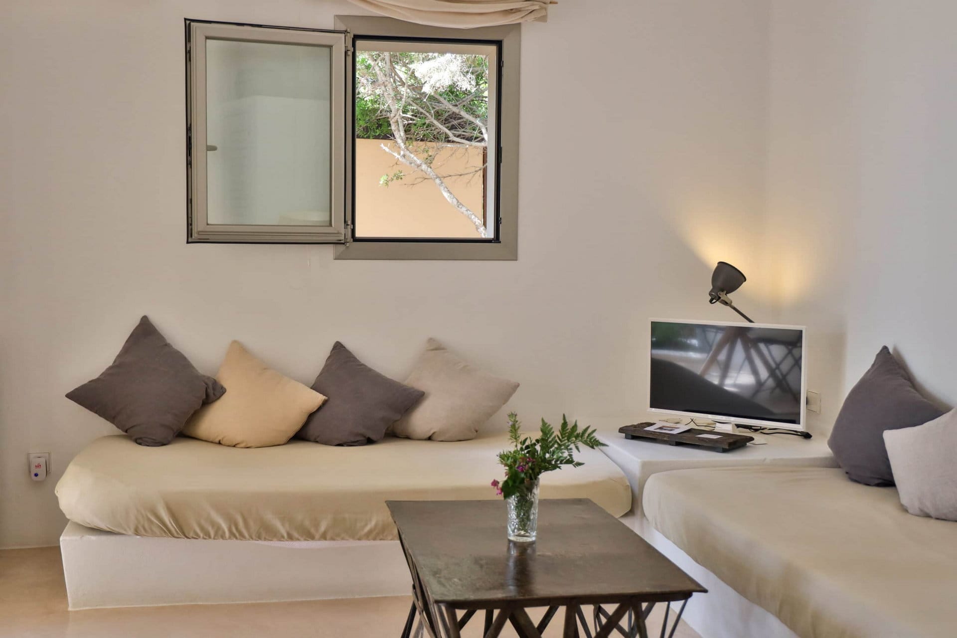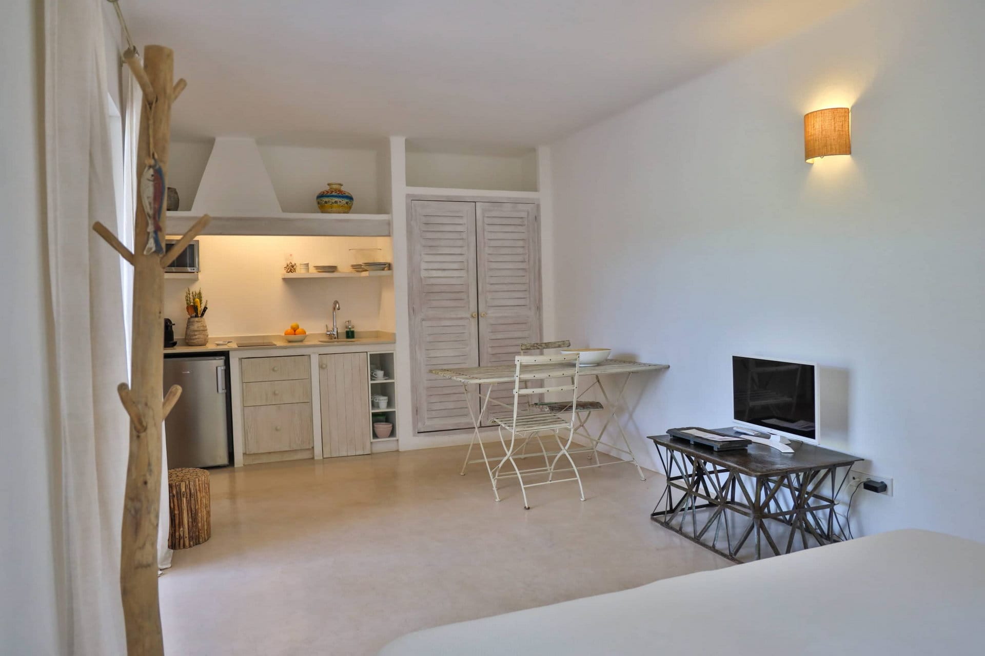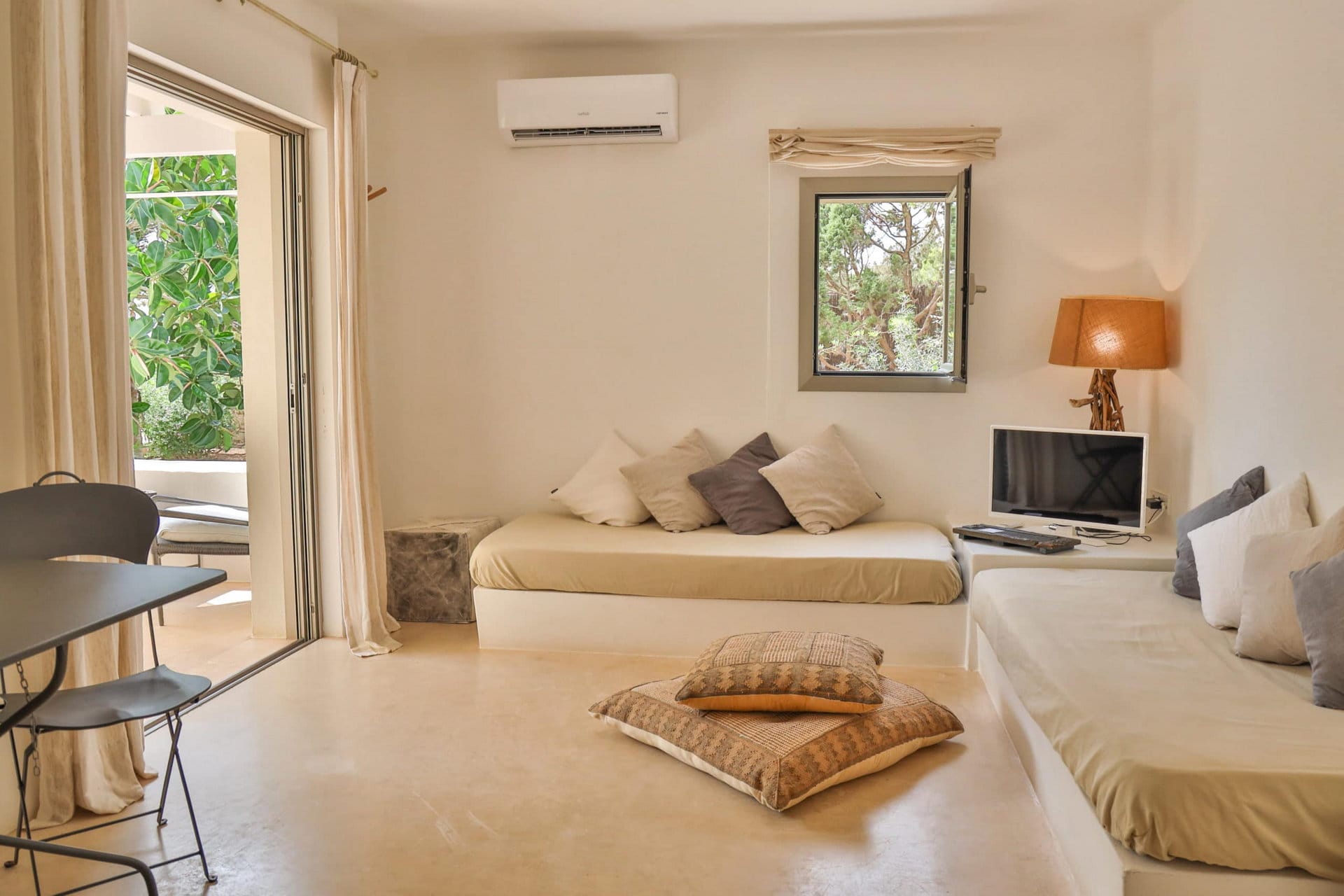 Each studio has a spacious terrace from which to enjoy the great gardens and the Mediterranean sun. All apartments are fully equipped (AC, TV, Fridge, Vitro, Microwave….) and nicely decorated. An open kitchen and lounge, and re-comforting good shower. This studio sleeps