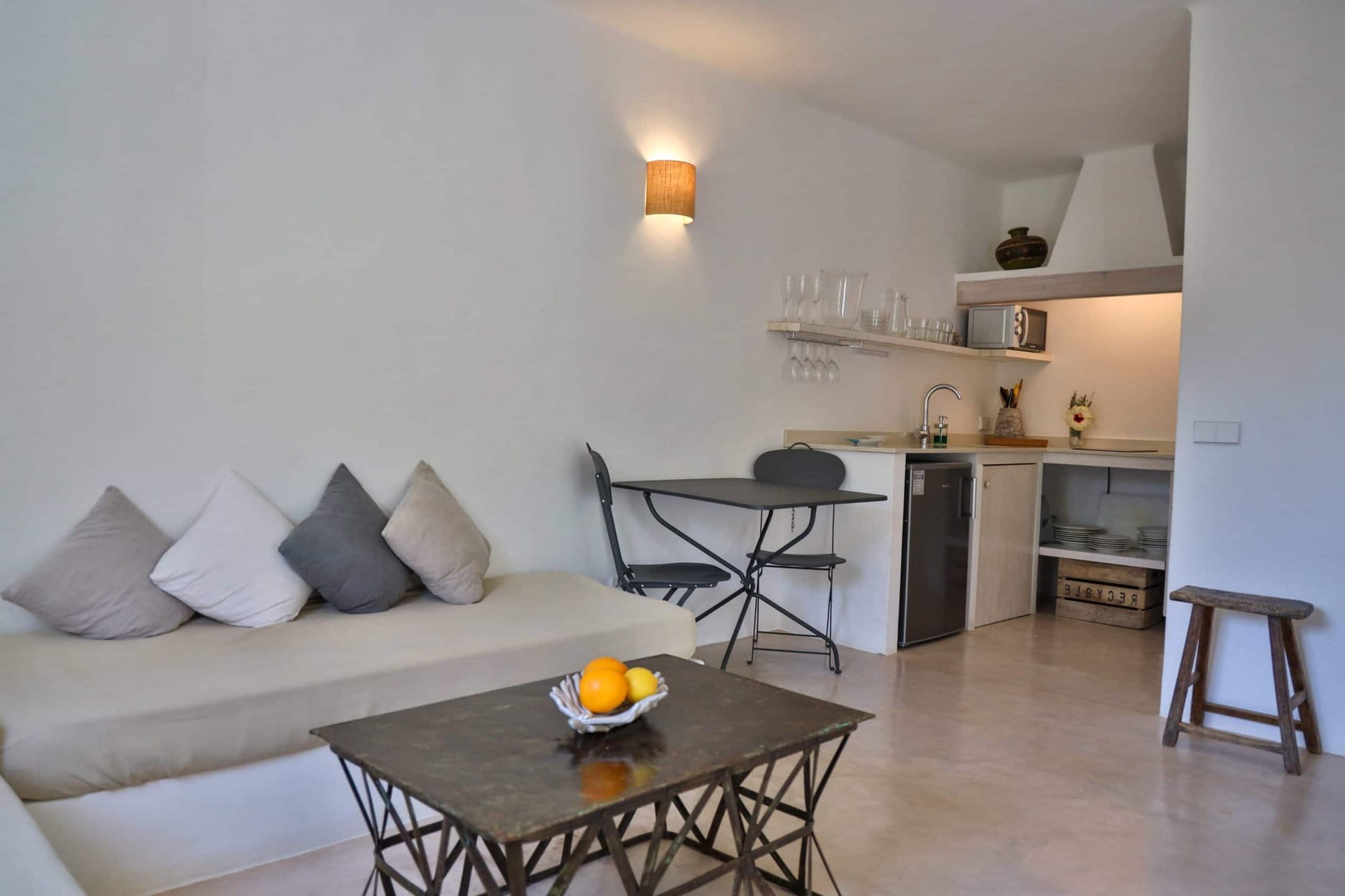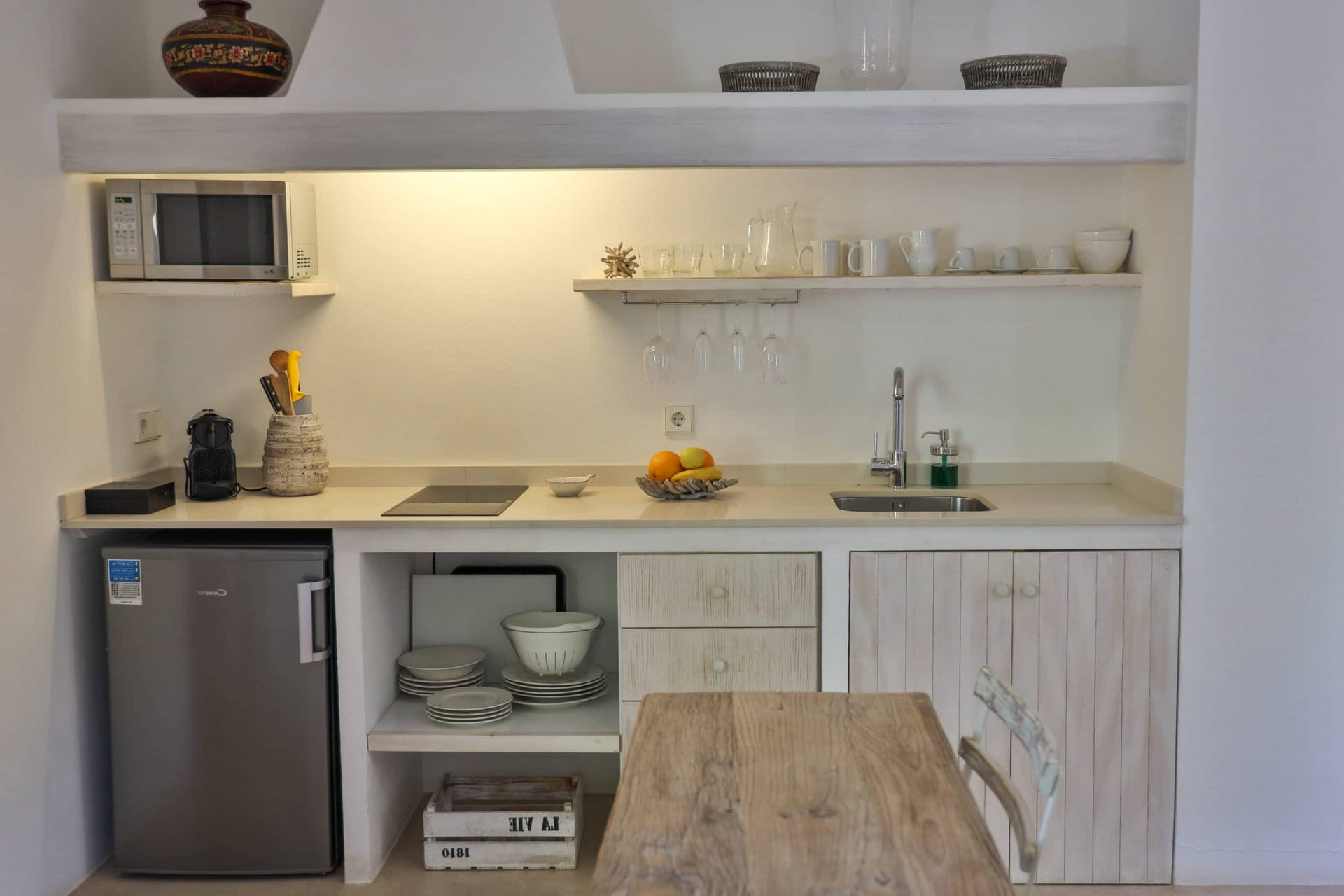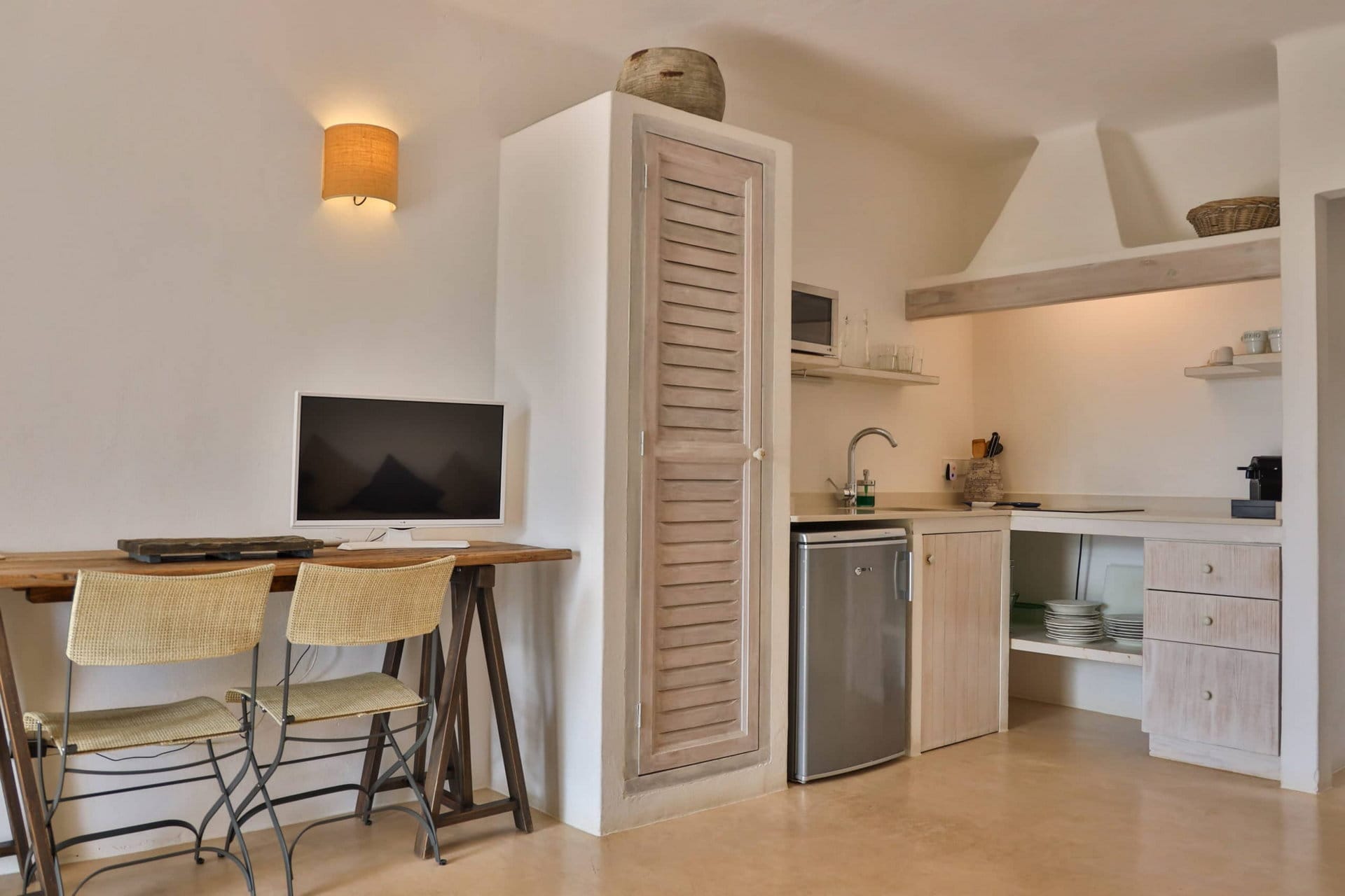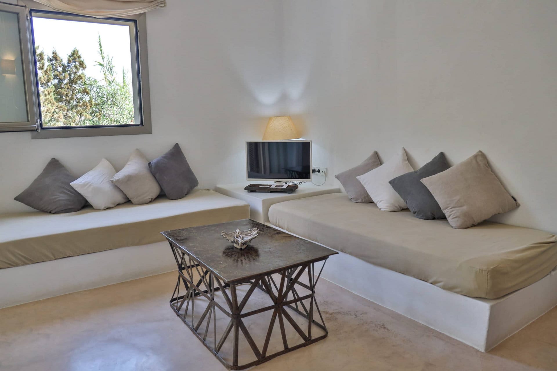 Each studio has a spacious terrace from which to enjoy the great gardens and the Mediterranean sun. All apartments are fully equipped (AC, TV, Fridge, Vitro, Microwave….) and nicely decorated. An open kitchen and lounge, and re-comforting good shower. This studio sleeps