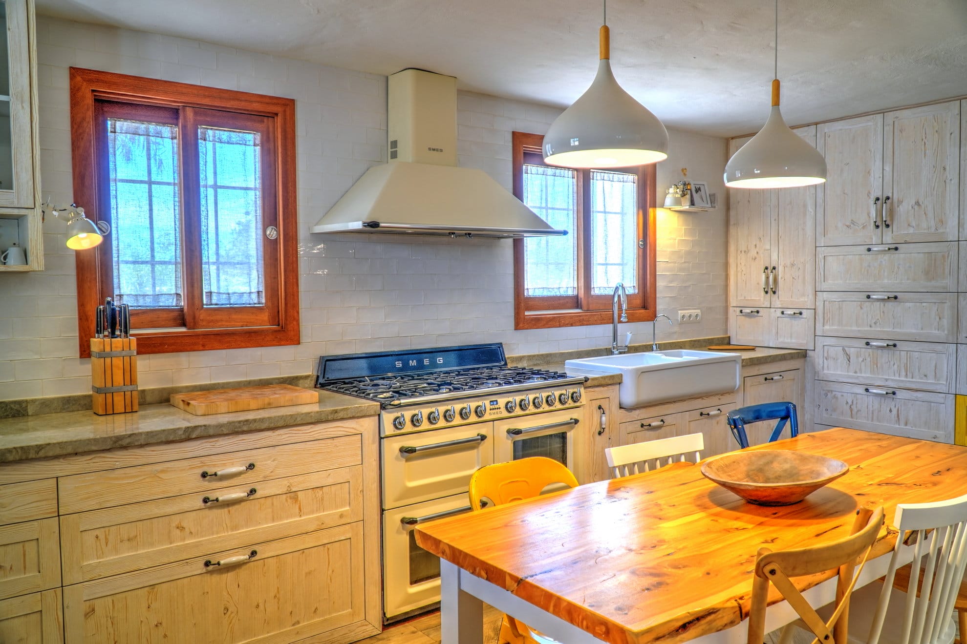Inside, you’ll find four double bedrooms and one single room, making it an ideal retreat for families or groups of friends. With three fully equipped bathrooms, comfort and privacy are guaranteed for all guests. The cozy living room, with its rustic décor and modern accessories, creates a warm and inviting ambiance, while the fully equipped kitchen provides everything needed to prepare delicious meals with fresh local ingredients.
