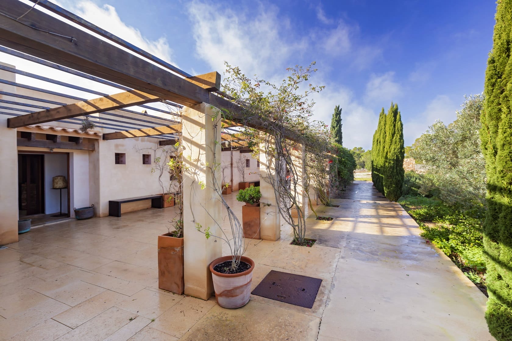 The villa is located just 5 minutes by car from the nearest beach, allowing easy access to Formentera’s crystal-clear waters and stunning coastline.