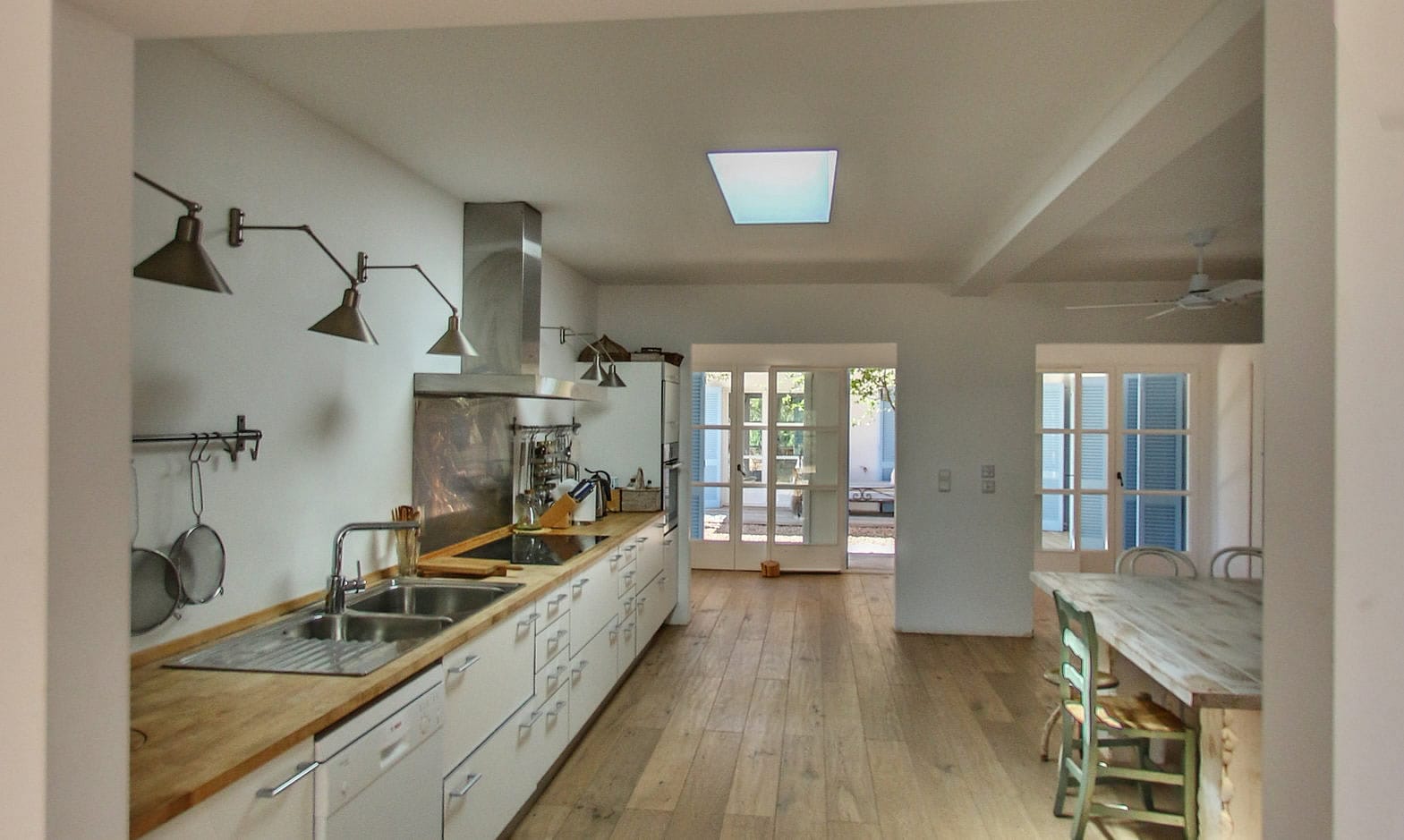 All bedrooms have direct access to terrace and porch. A large and bright living area with comfortable sofas and fireplace have direct access to the beautiful covered veranda and porch. The large kitchen is fully equipped and has also access to the external dining room.