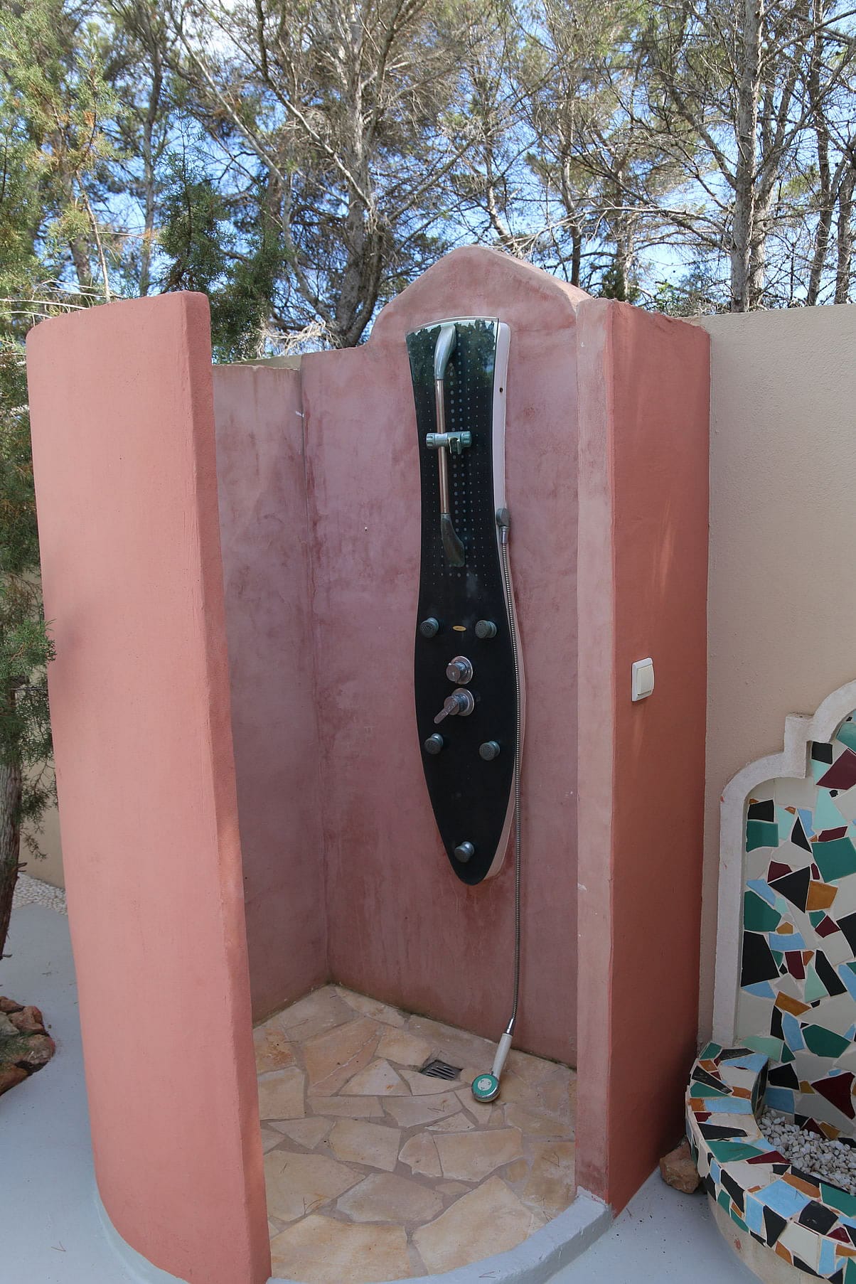 Surrounded by lush Mediterranean landscapes, the property boasts an expansive outdoor area designed for relaxation and entertainment. The large private swimming pool is perfect for cooling off during warm summer days, while the summer kitchen and outdoor dining area invite guests to enjoy alfresco meals under the stars. A spacious shaded porch with a long dining table provides the ideal setting for gatherings, and an outdoor shower adds to the convenience and comfort of this unique home.