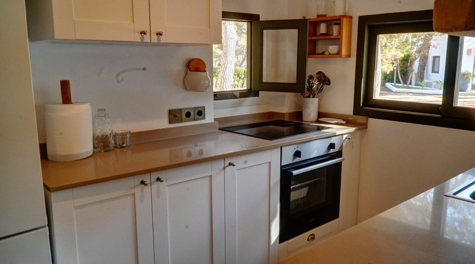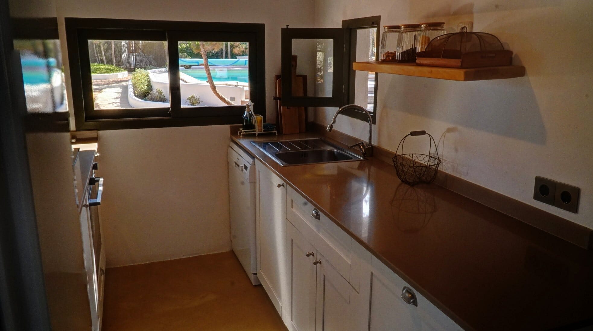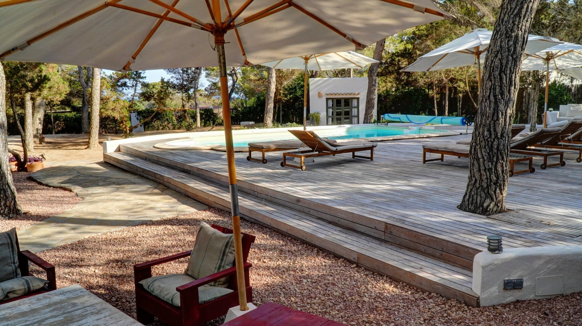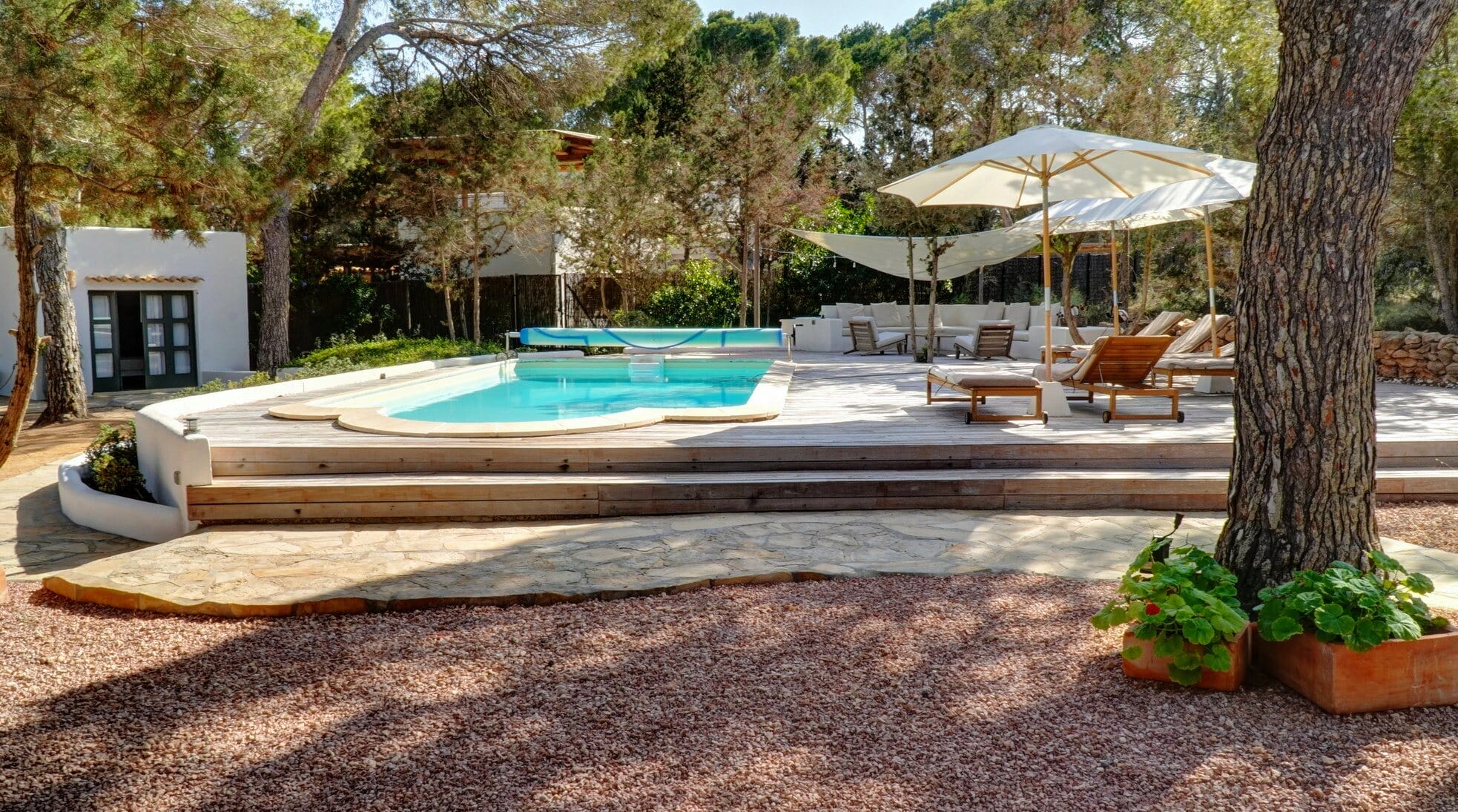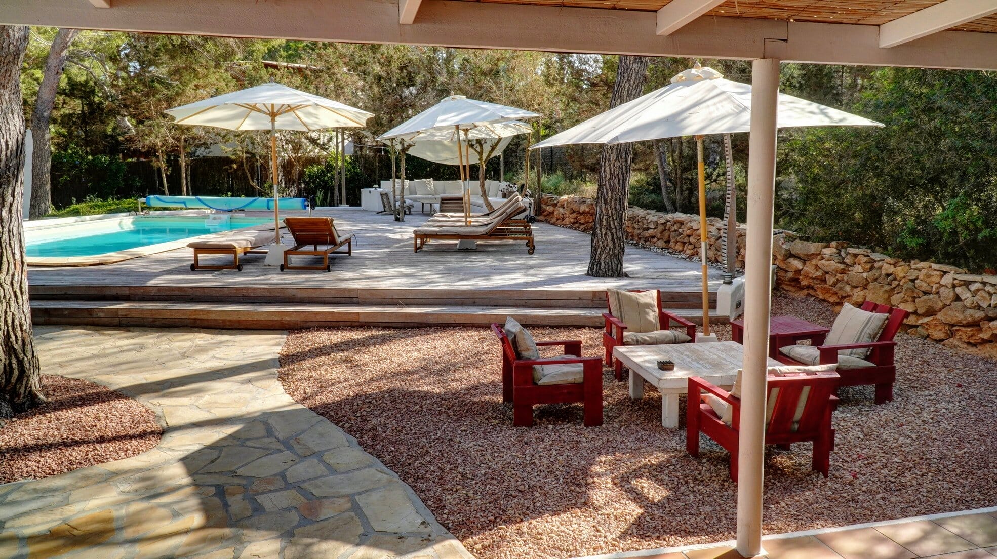 The heart of the villa, featuring a spacious living and dining area, a fully equipped kitchen, 3 double bedrooms, and 2 bathrooms. From the living room, step outside to the garden, where you can enjoy an outdoor dining and lounge area – perfect for al fresco meals. The villa’s private pool comes with a well-appointed solarium for the ultimate in relaxation.
