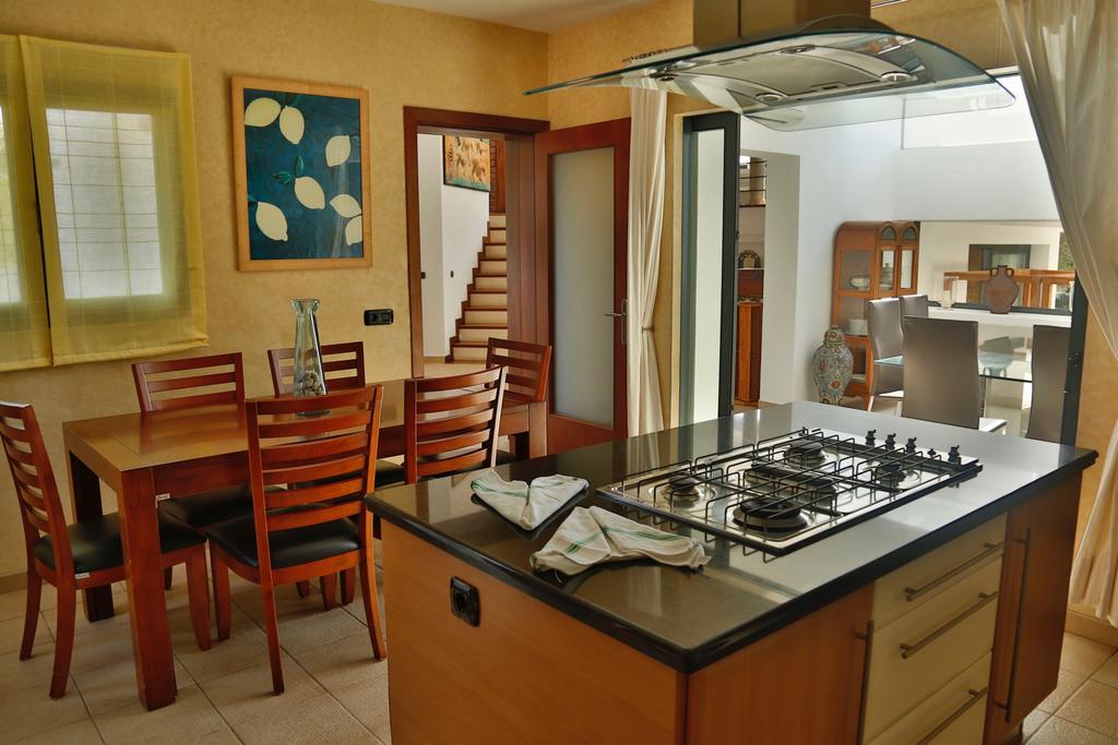 The spacious ground floor features an inviting lounge area with a 5-meter-high ceiling, a relaxing sofa space, and a panoramic TV with satellite and DVD. This leads into a fully equipped modern kitchen and a large dining room with direct access to the garden and covered porch, perfect for al fresco dining.