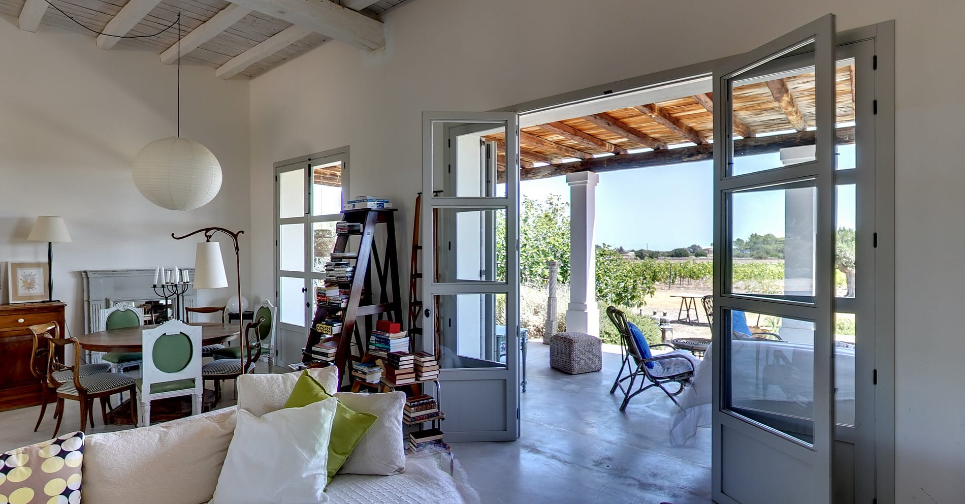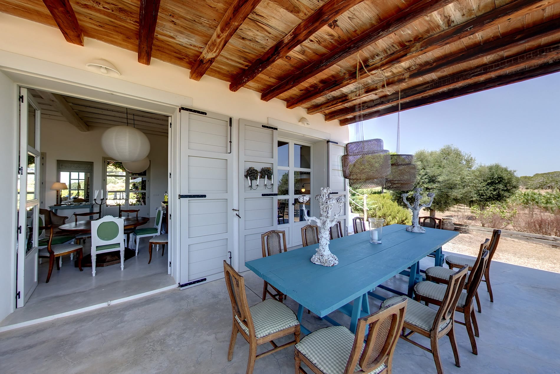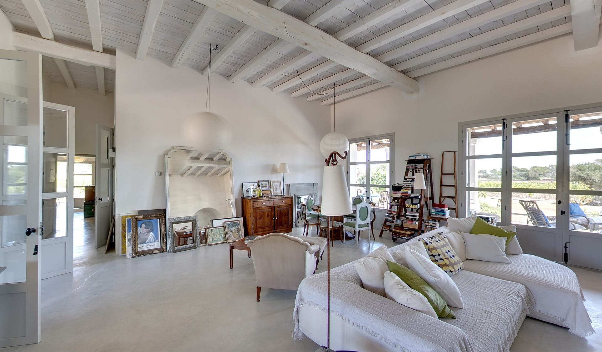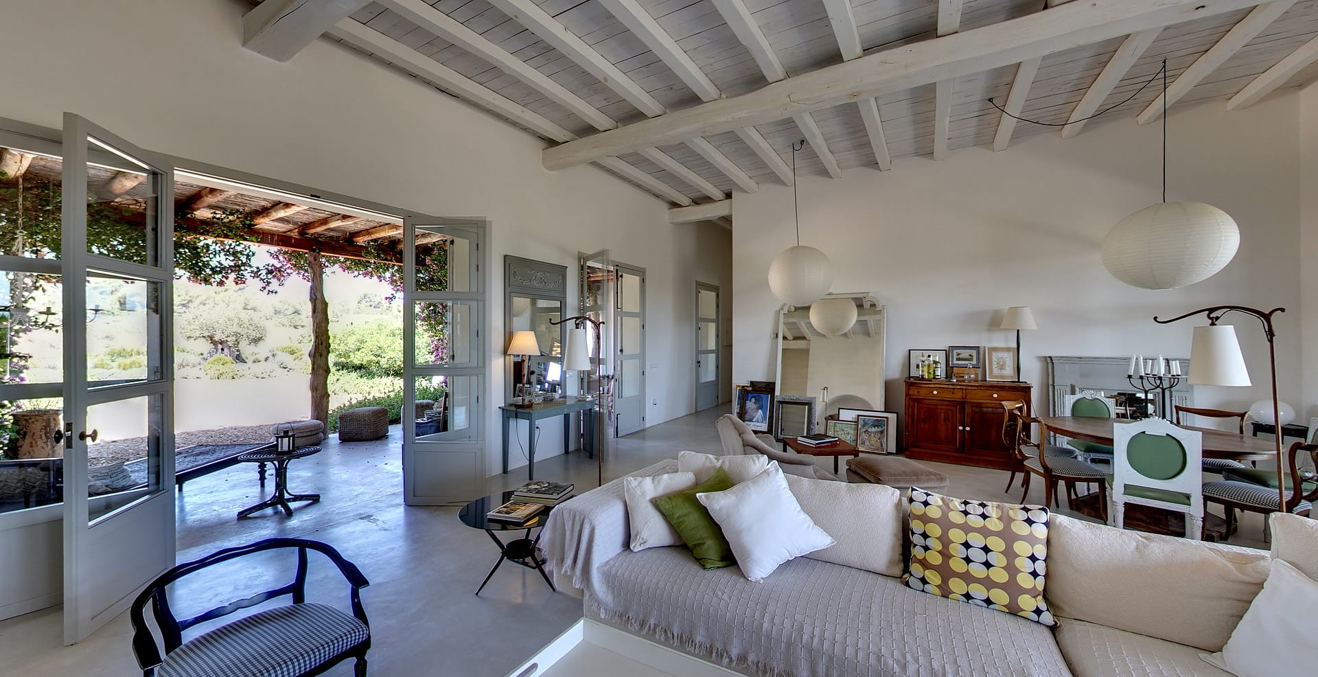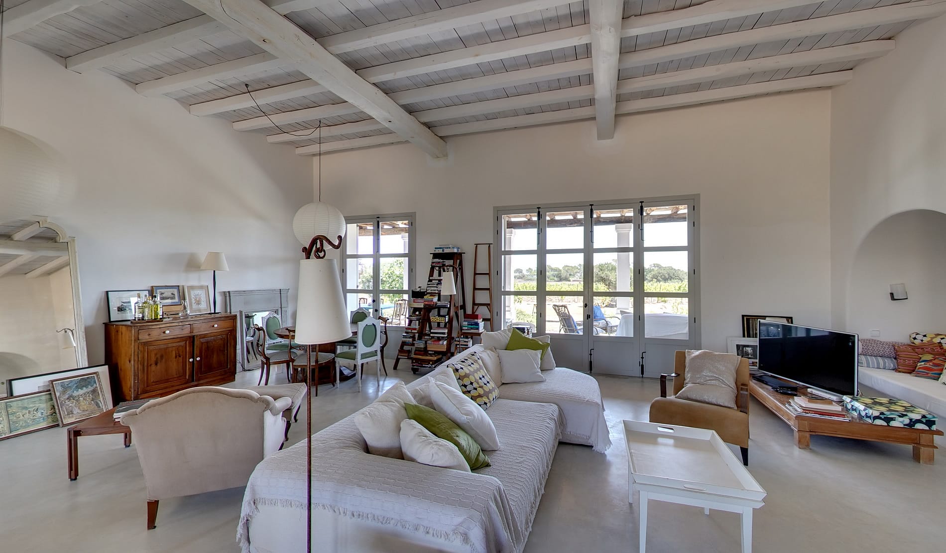The main living area is an inviting and elegant space with a spacious lounge equipped with plush sofas and satellite TV. The décor perfectly balances modern aesthetics with rustic charm, creating a sophisticated yet comfortable atmosphere. From the living room, guests can access a large covered veranda, furnished with antique pieces and cozy sofas, ideal for unwinding at any time of the day.