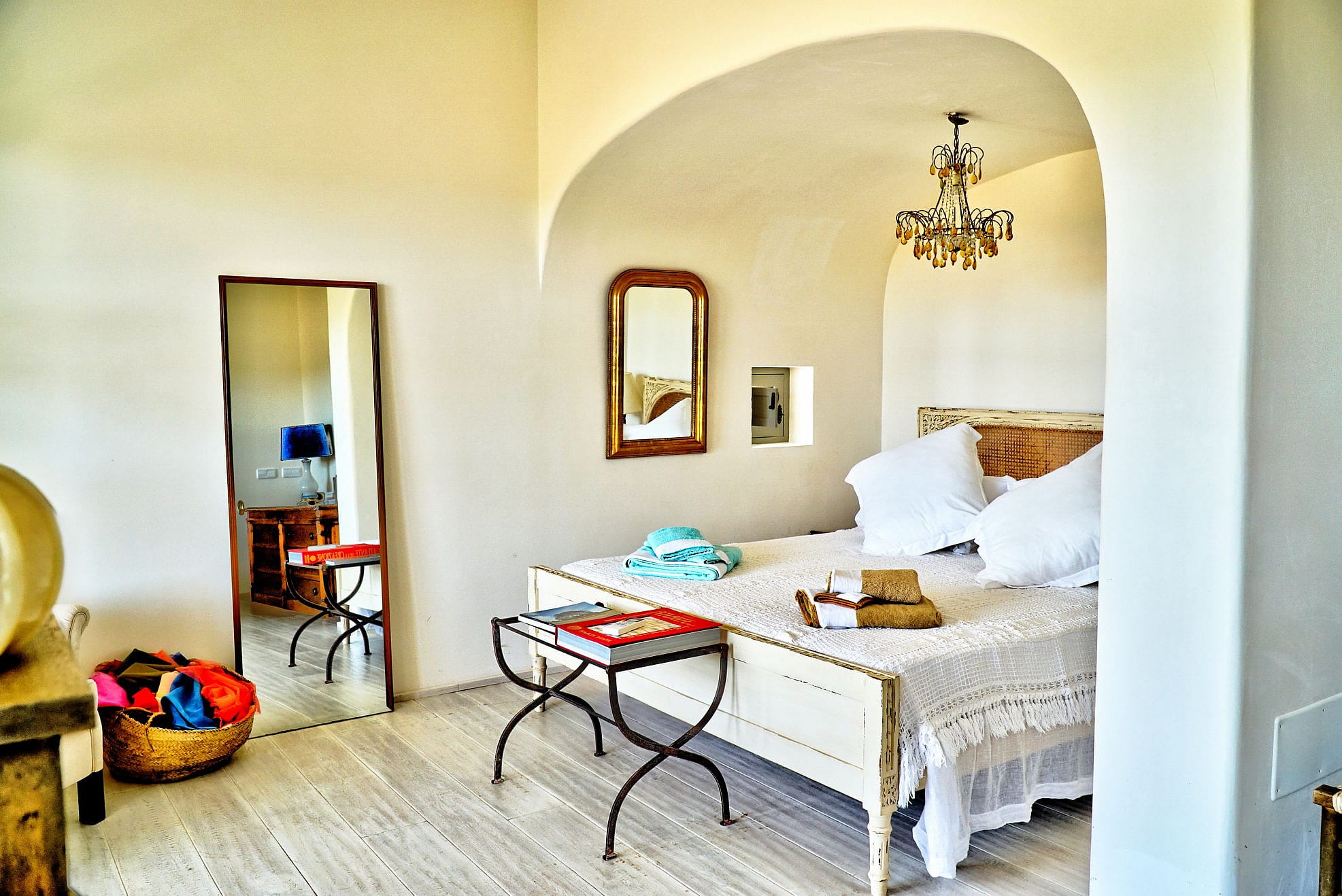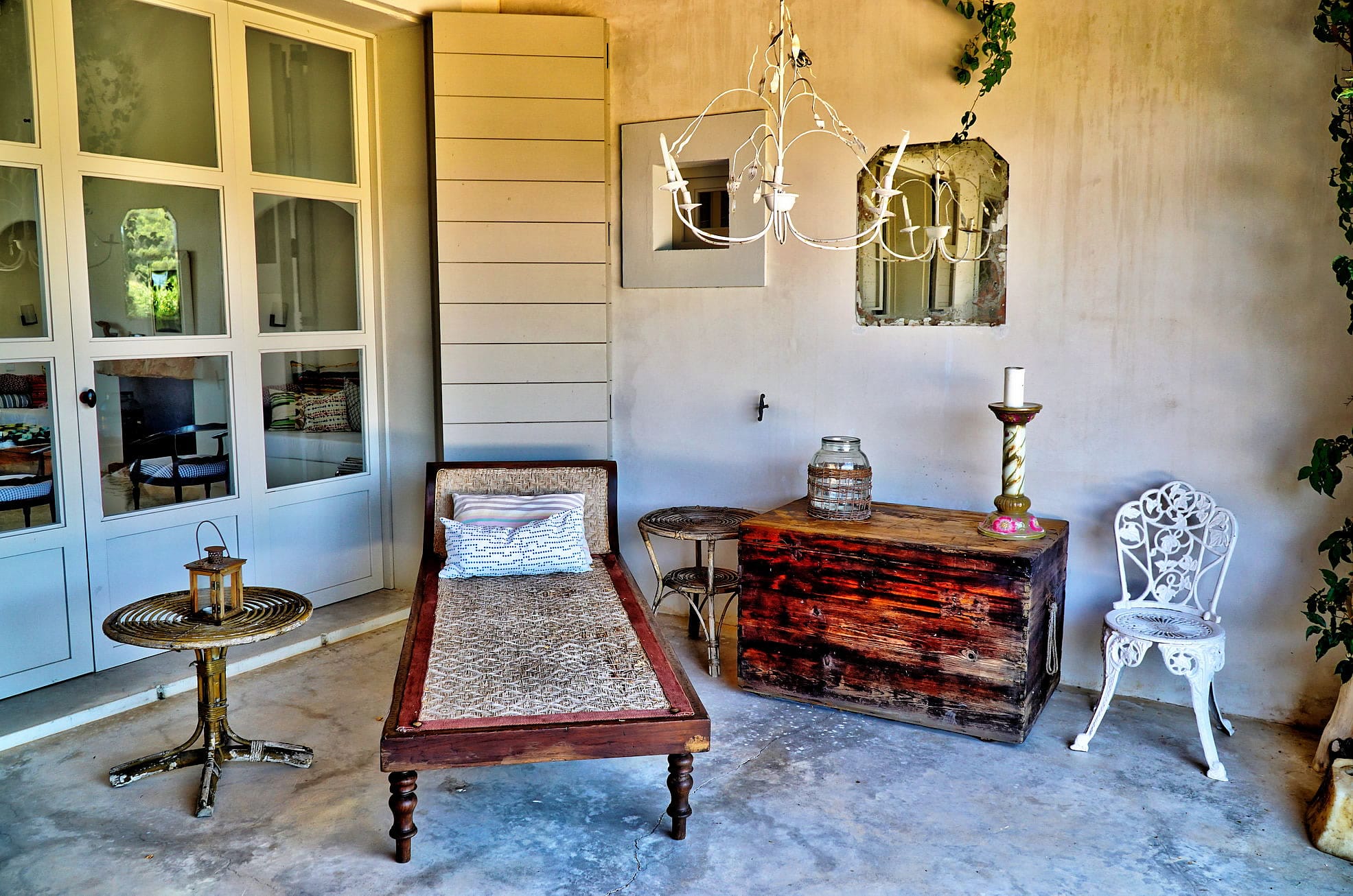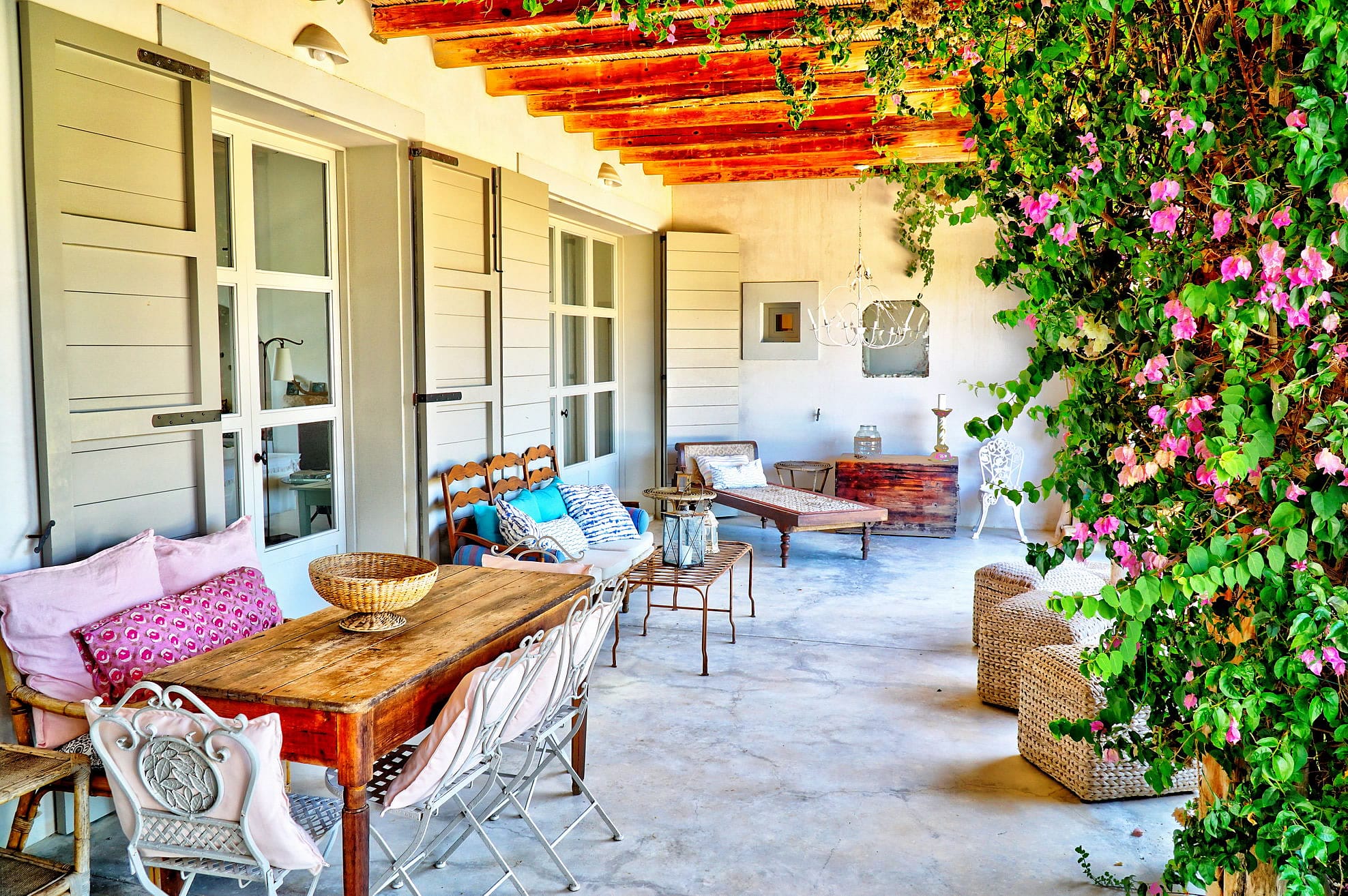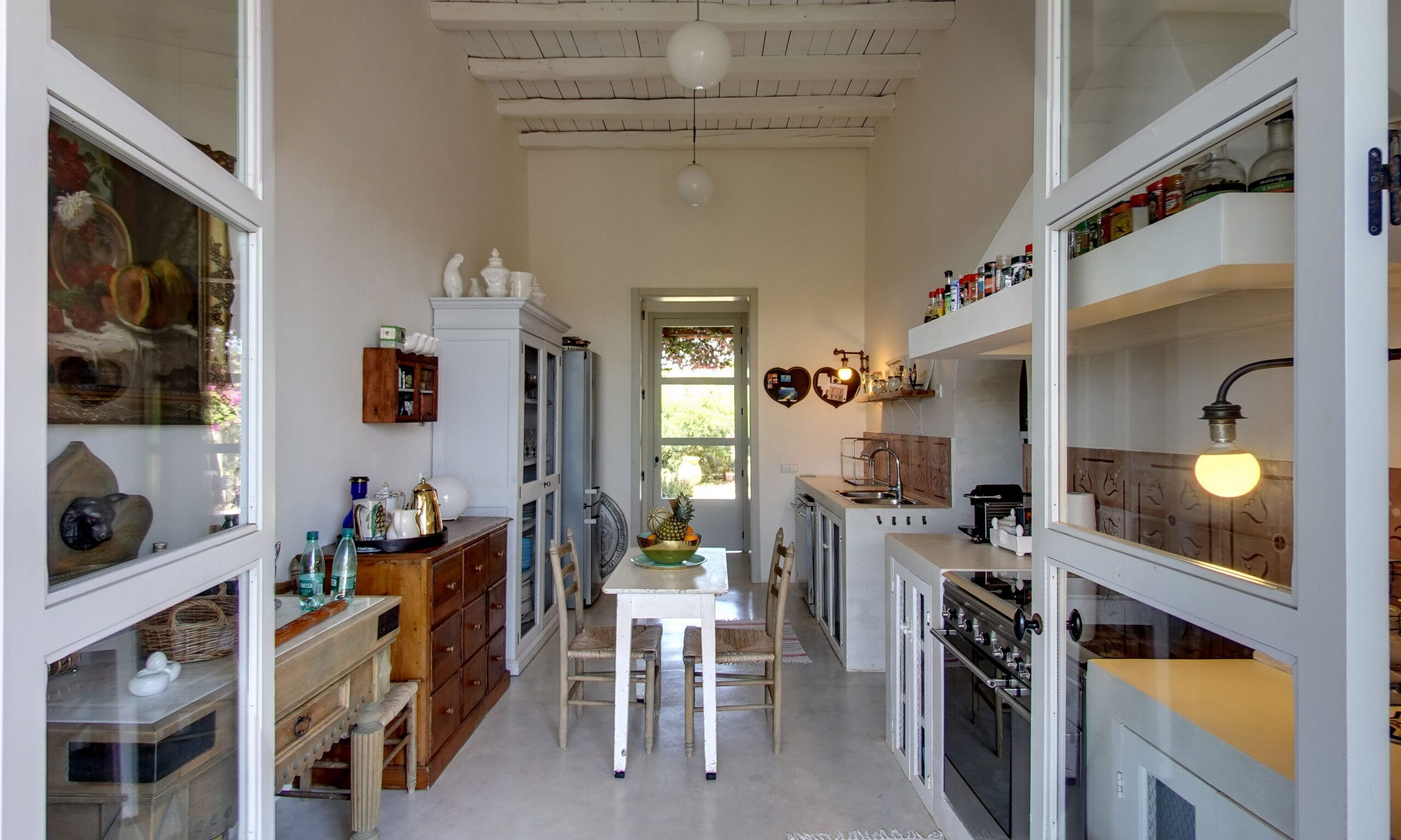 The main living area is an inviting and elegant space with a spacious lounge equipped with plush sofas and satellite TV. The décor perfectly balances modern aesthetics with rustic charm, creating a sophisticated yet comfortable atmosphere. From the living room, guests can access a large covered veranda, furnished with antique pieces and cozy sofas, ideal for unwinding at any time of the day.