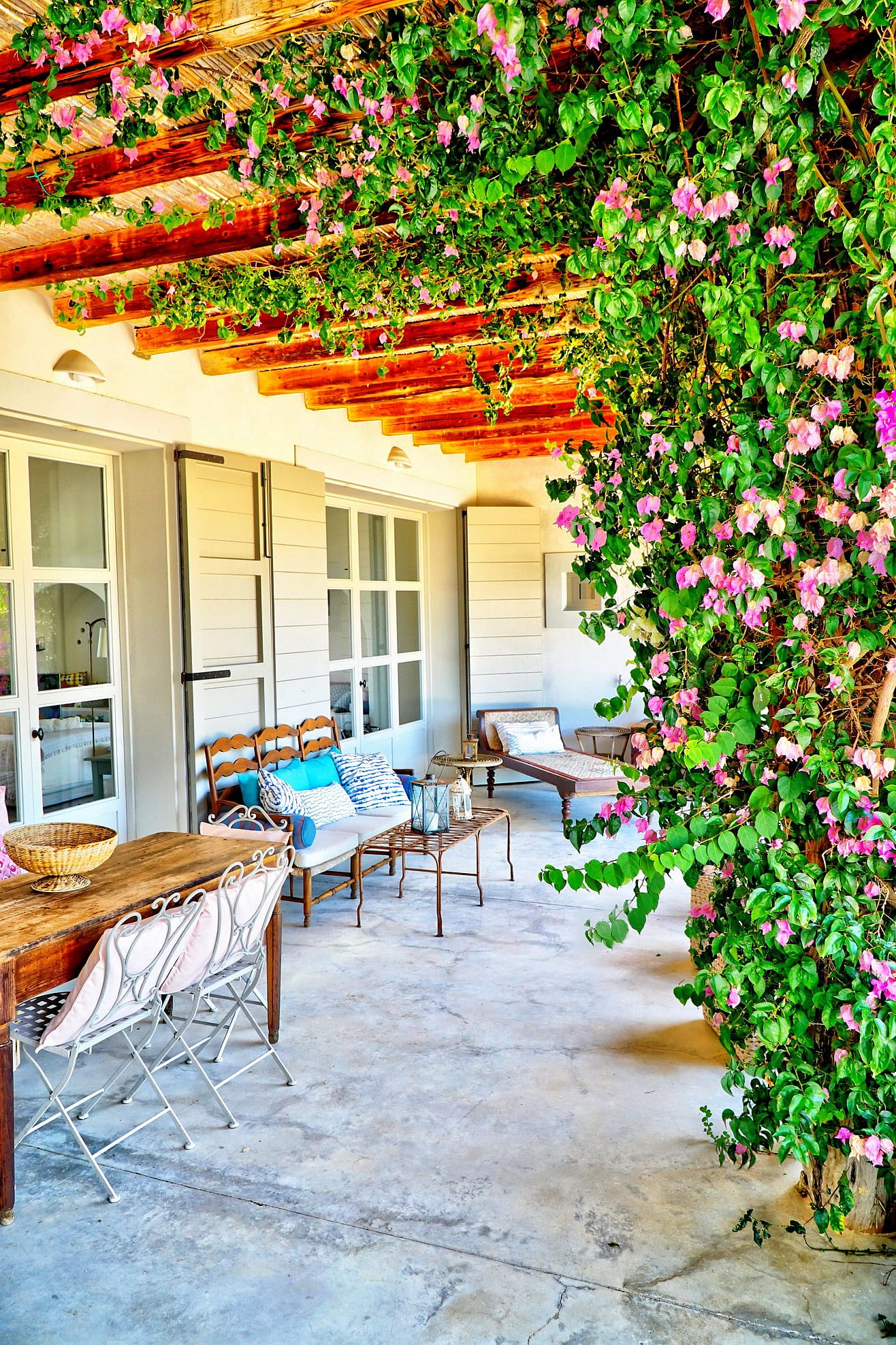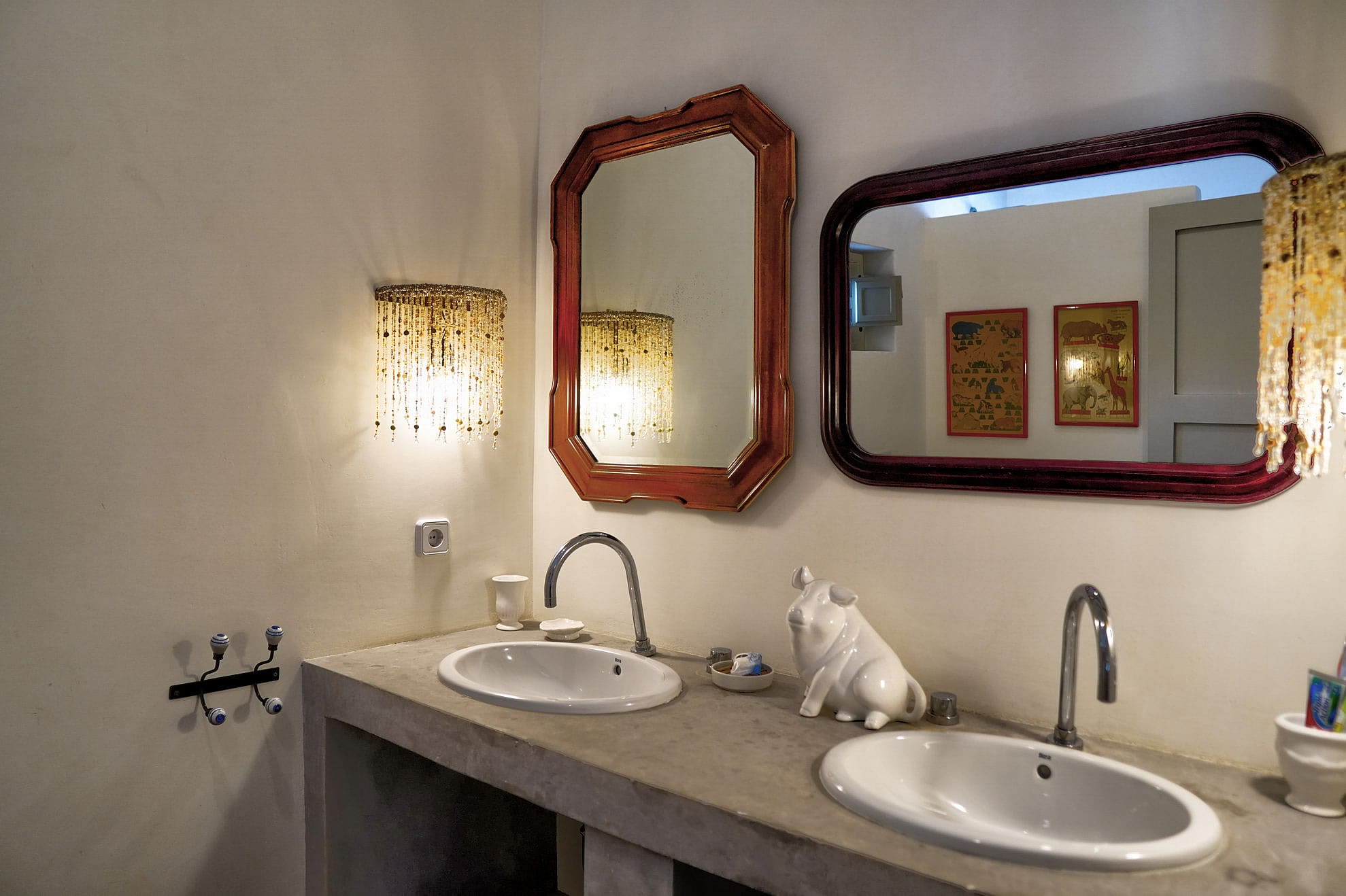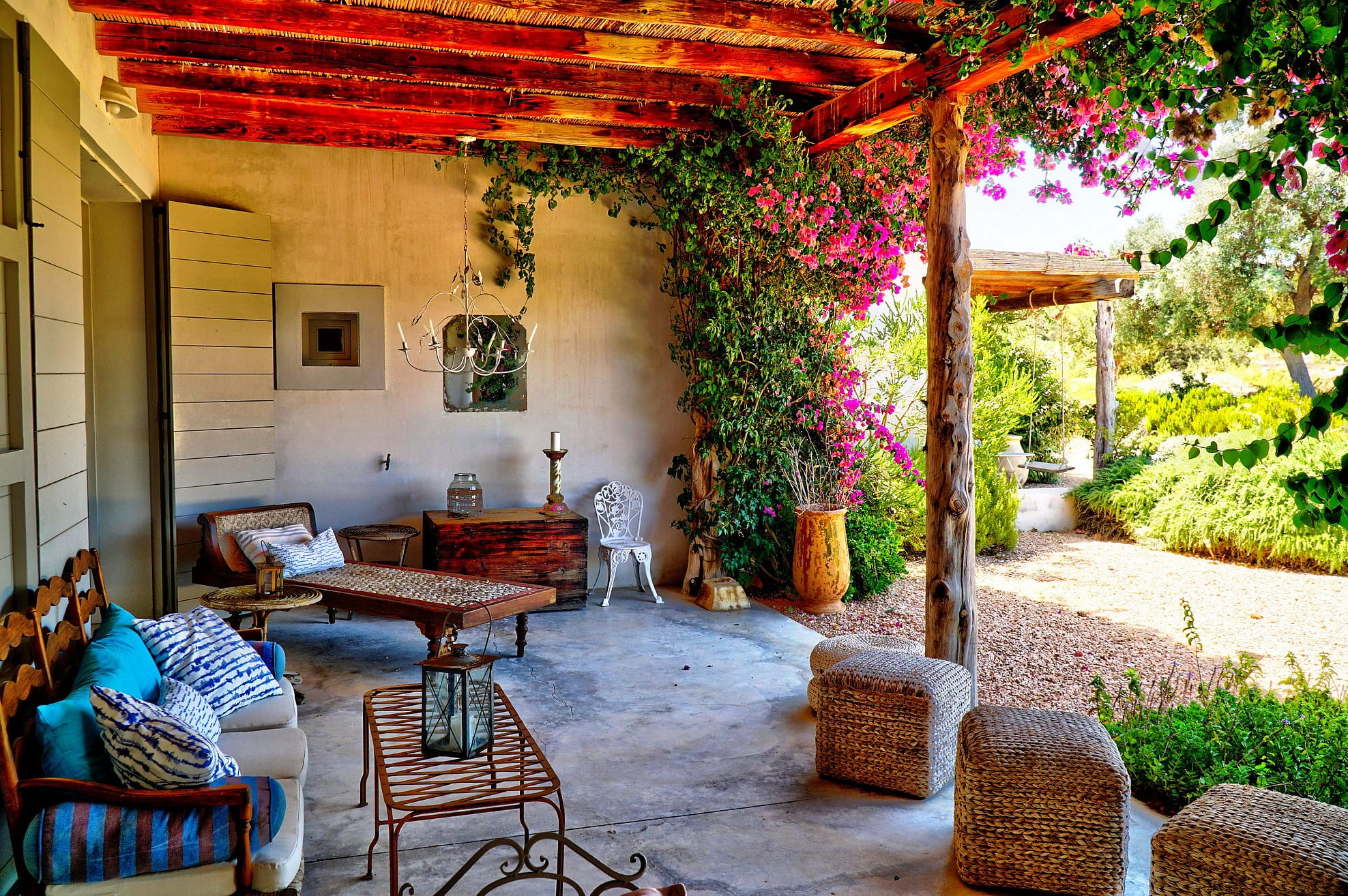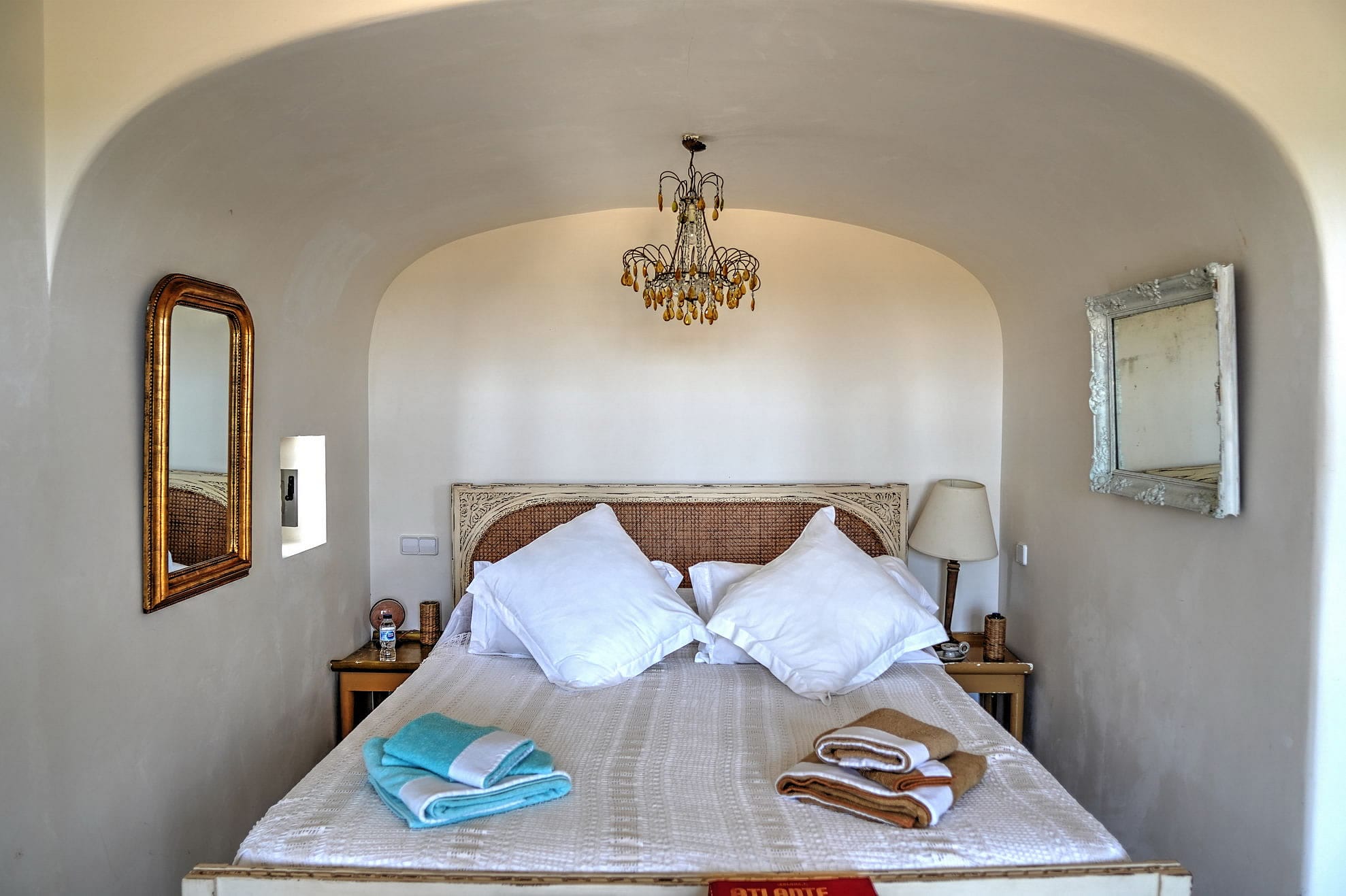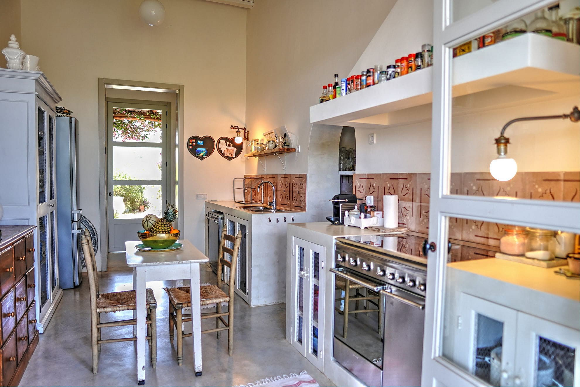 The main living area is an inviting and elegant space with a spacious lounge equipped with plush sofas and satellite TV. The décor perfectly balances modern aesthetics with rustic charm, creating a sophisticated yet comfortable atmosphere. From the living room, guests can access a large covered veranda, furnished with antique pieces and cozy sofas, ideal for unwinding at any time of the day.