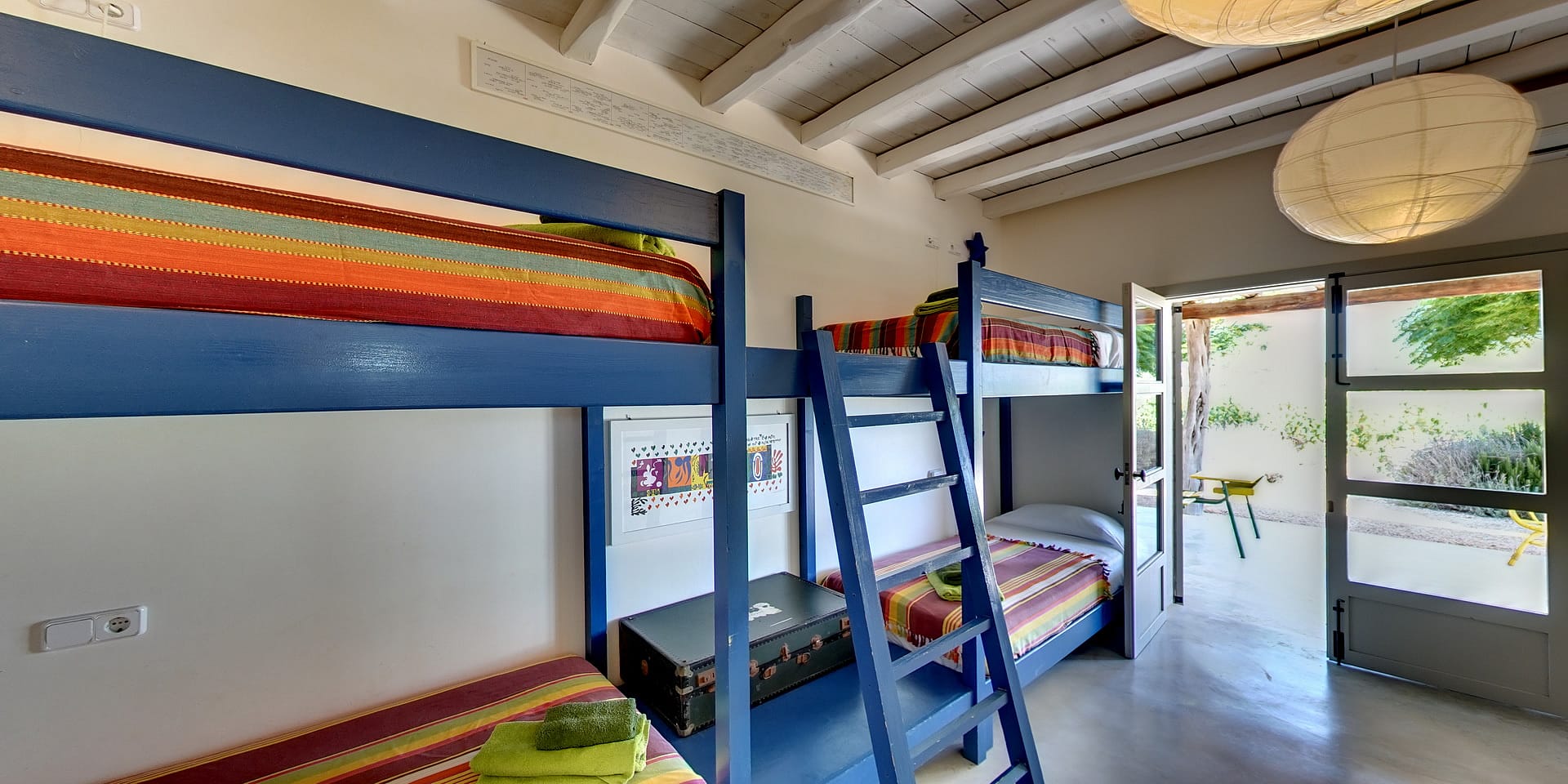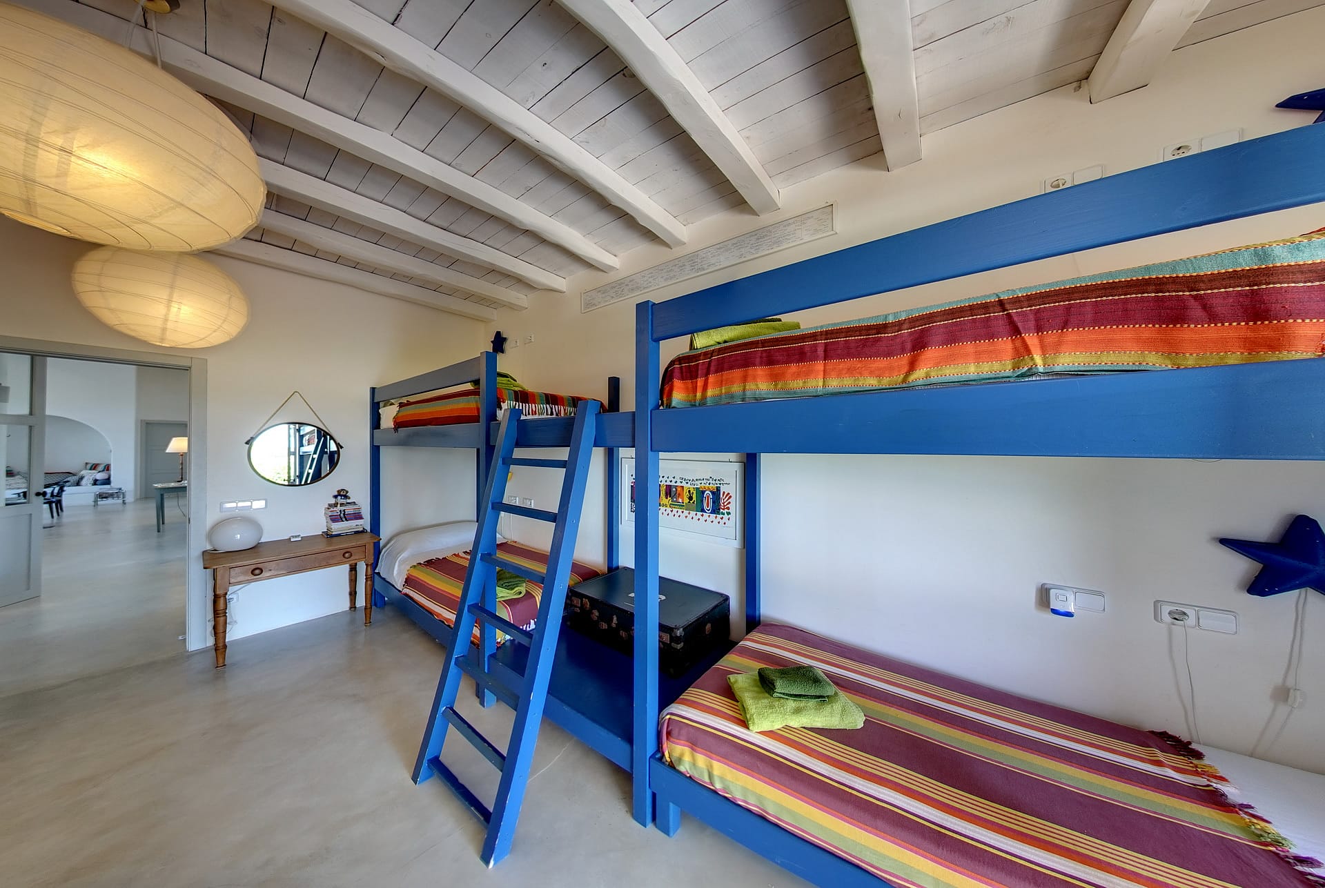 Designed with a concept of space and natural light, the property features large windows that create a seamless connection between the indoor and outdoor areas. Accommodating up to 12 guests, the villa has five bedrooms—two with double beds, two with twin beds, and one with bunk beds—all with access to private terraces, offering a peaceful retreat for every guest. There are four bathrooms, ensuring comfort and privacy for all occupants.