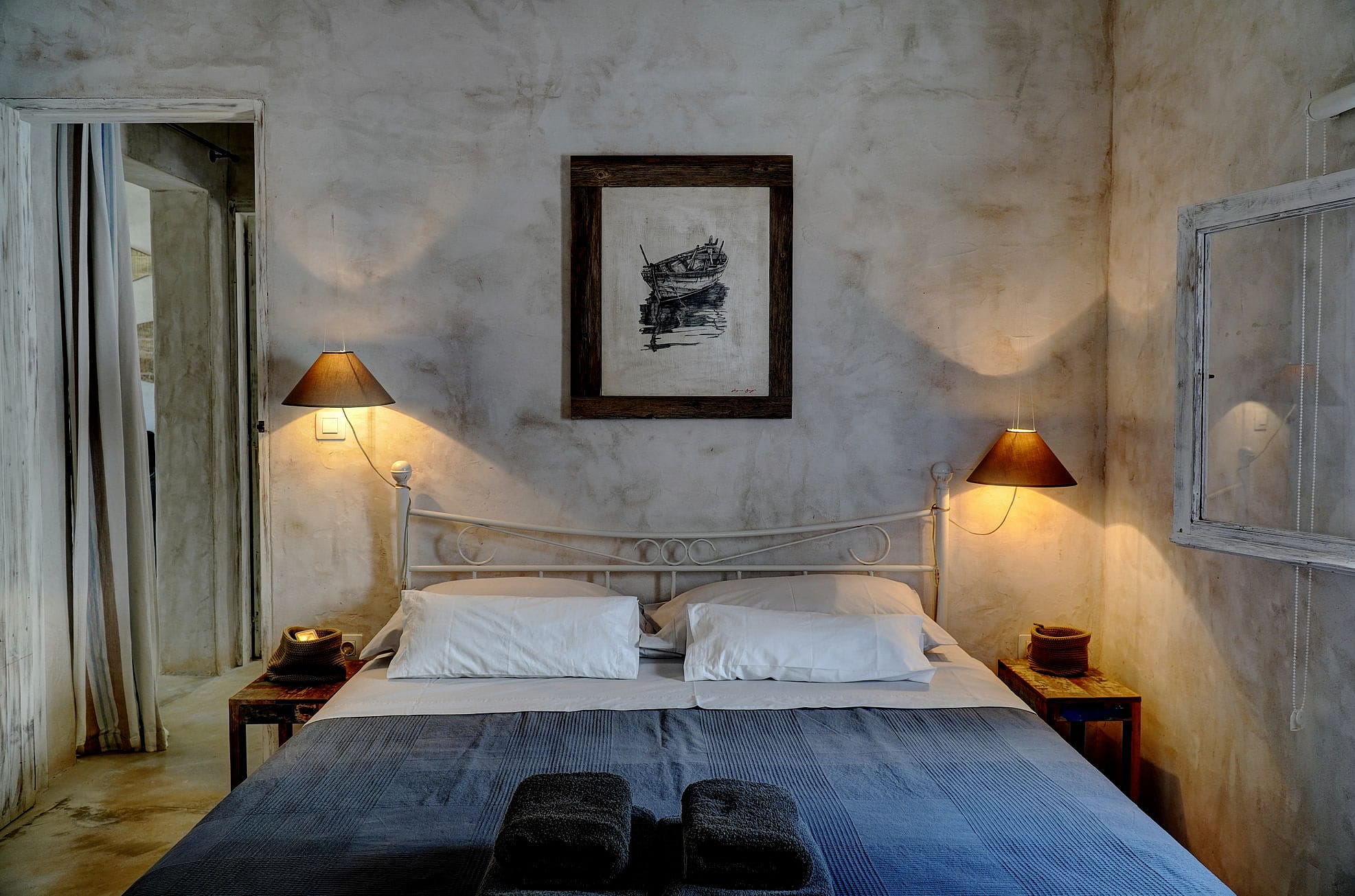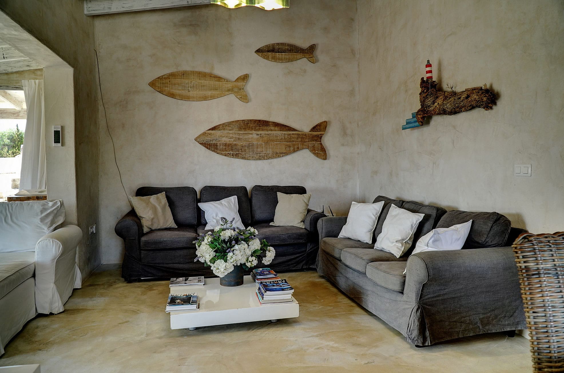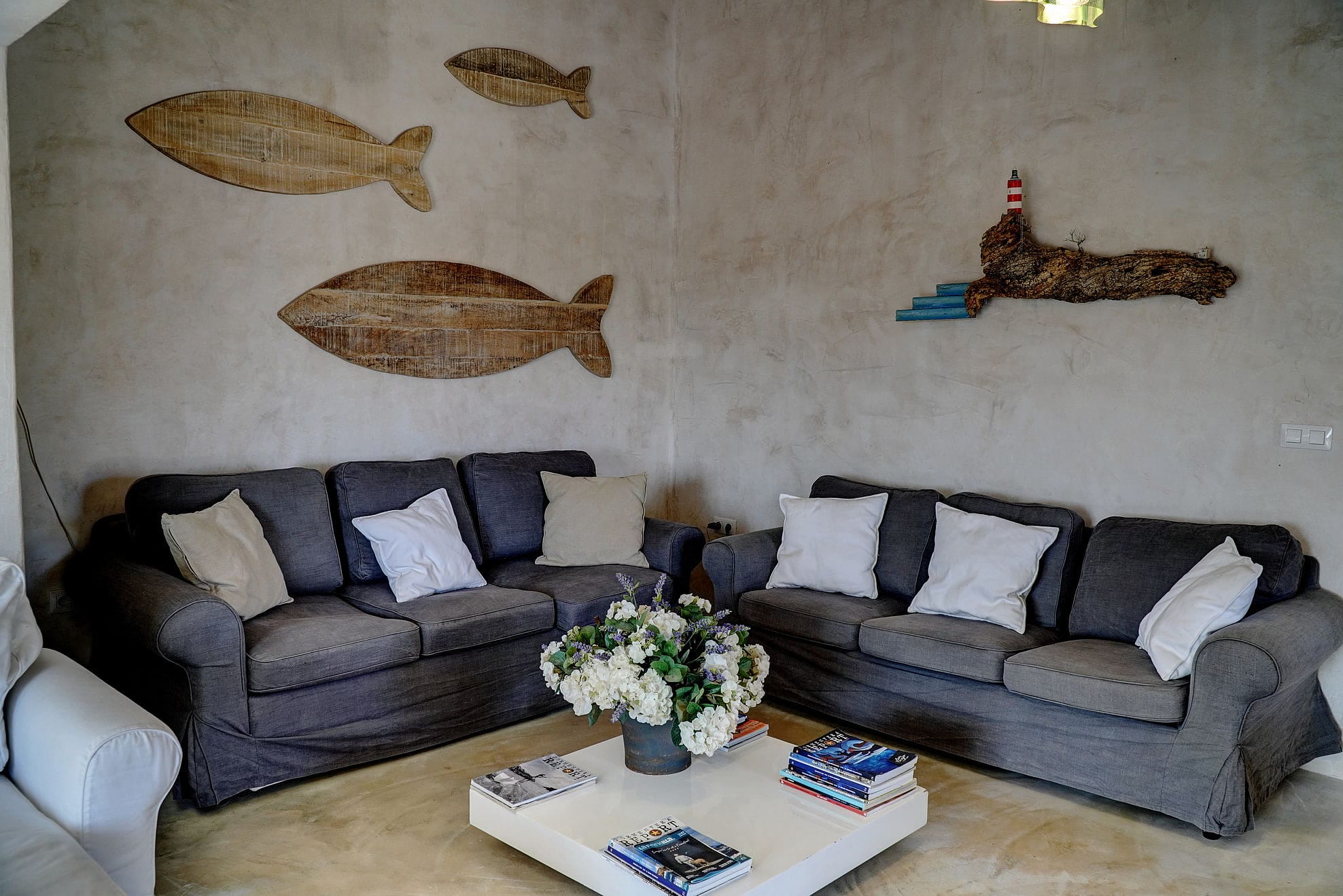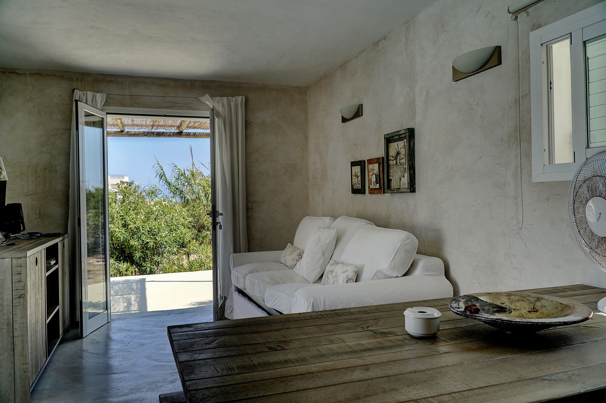 Inside the main house, you’ll find two elegant double bedrooms, designed for restful nights, along with two modern bathrooms that ensure comfort and convenience. The spacious living room provides the perfect space for relaxation after a day exploring the island. The open-plan, fully equipped kitchen is ideal for preparing meals with fresh local ingredients, offering both style and functionality.