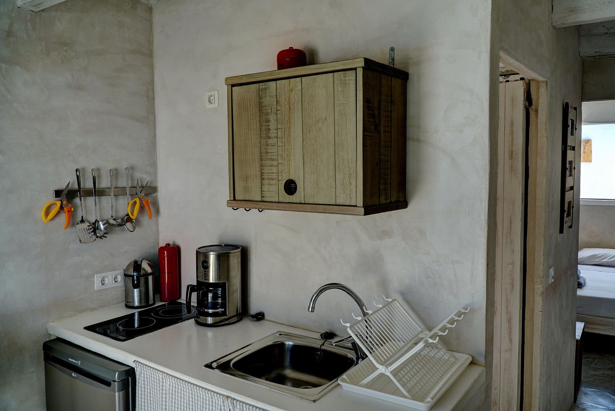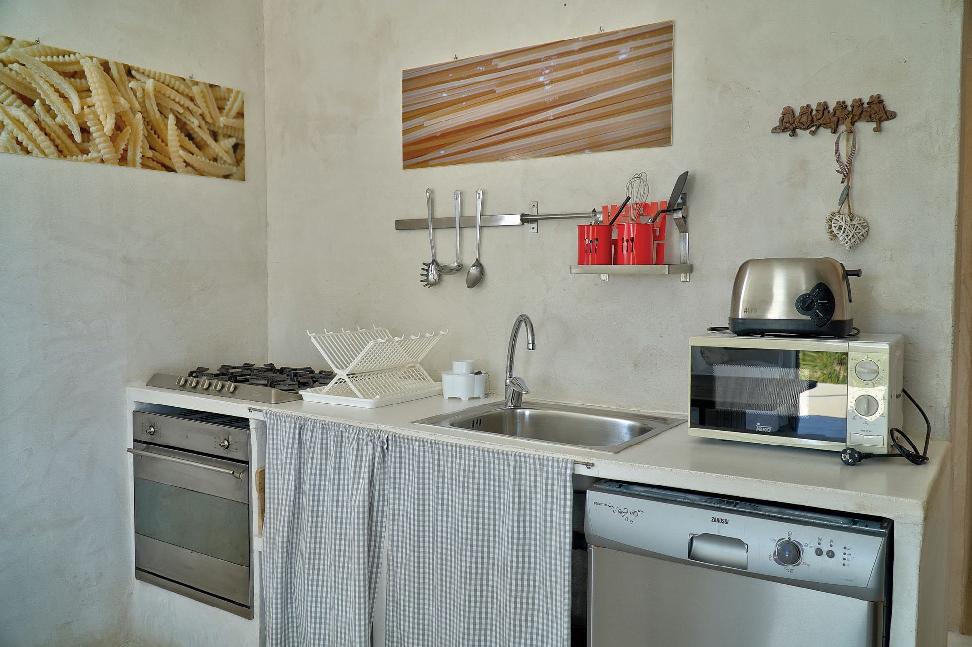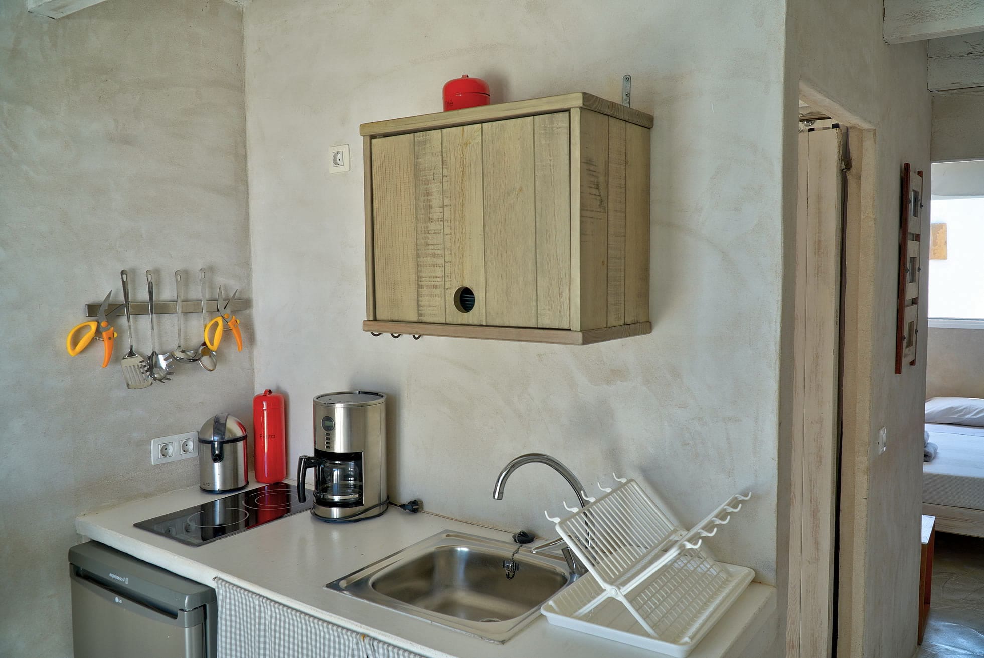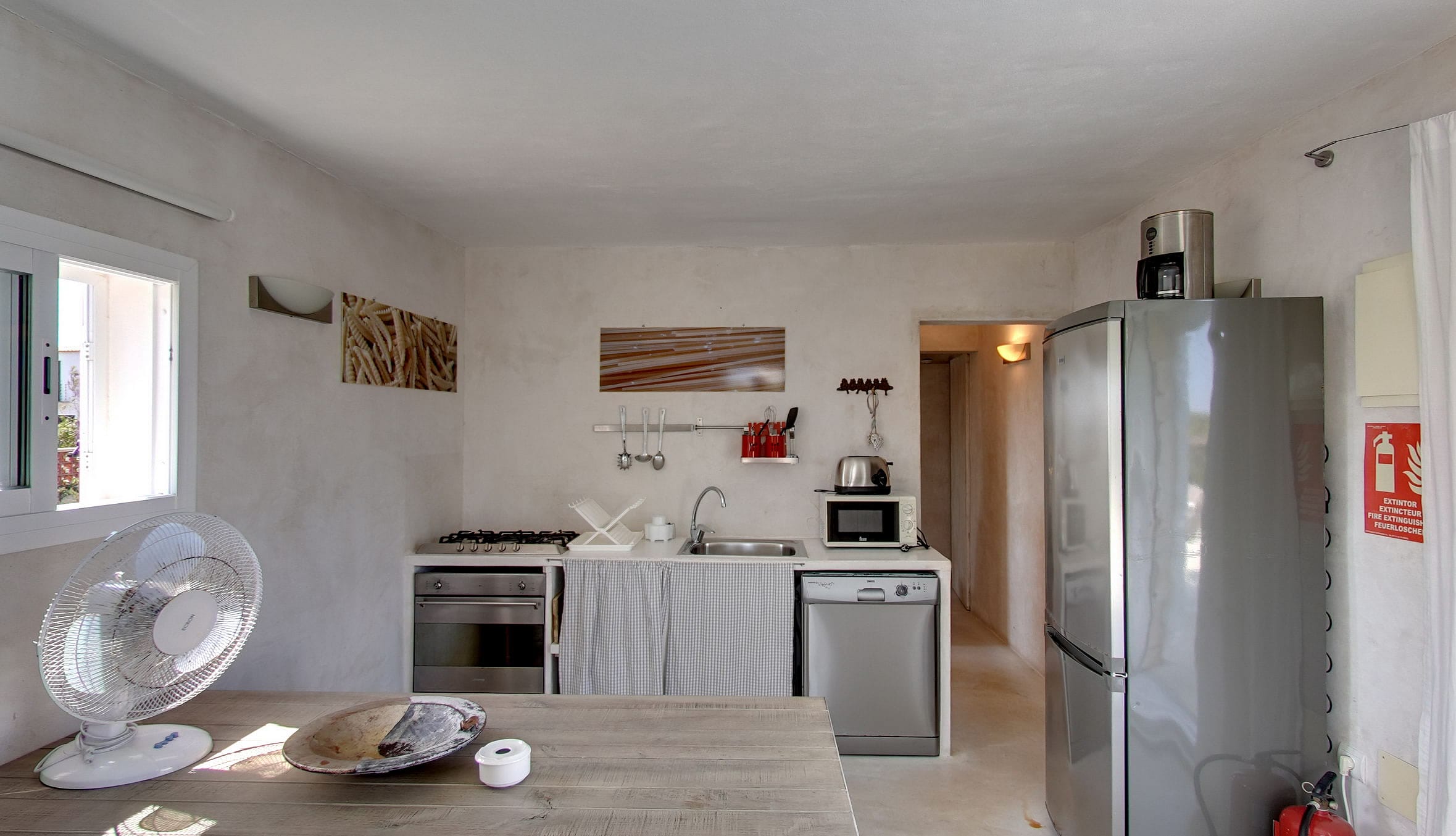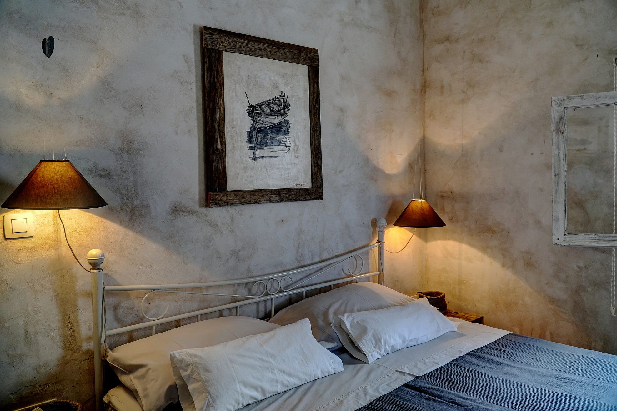 Inside the main house, you’ll find two elegant double bedrooms, designed for restful nights, along with two modern bathrooms that ensure comfort and convenience. The spacious living room provides the perfect space for relaxation after a day exploring the island. The open-plan, fully equipped kitchen is ideal for preparing meals with fresh local ingredients, offering both style and functionality.