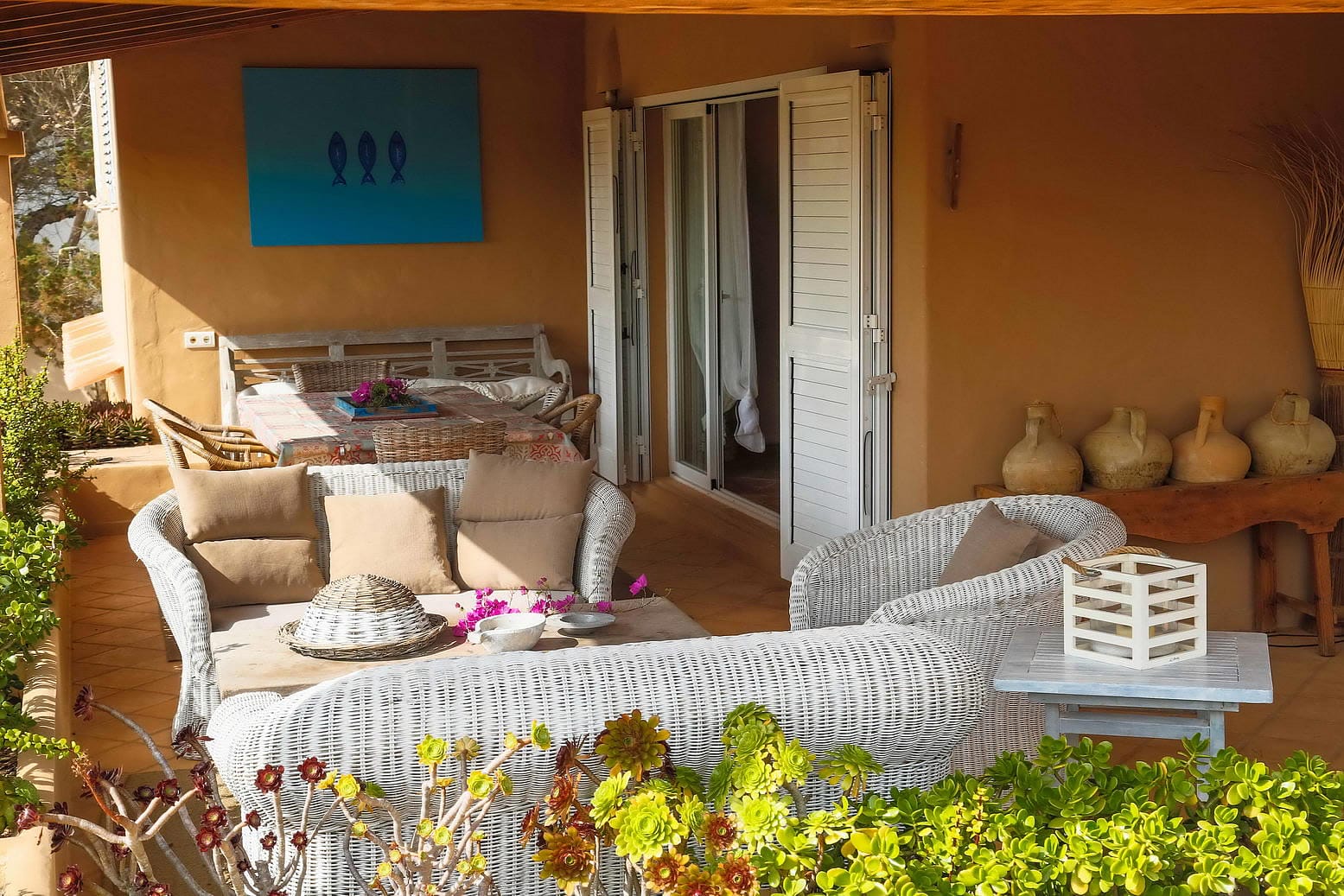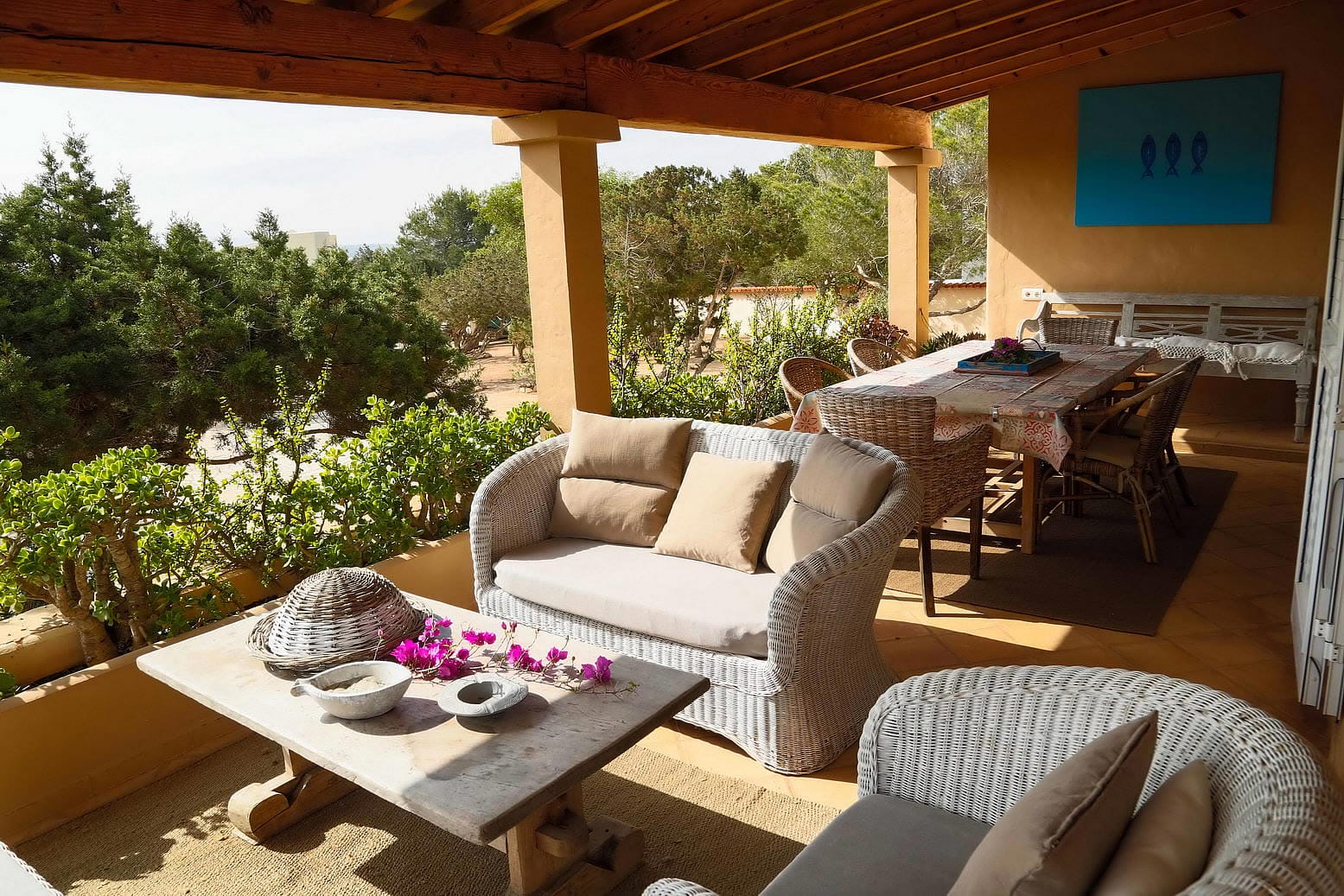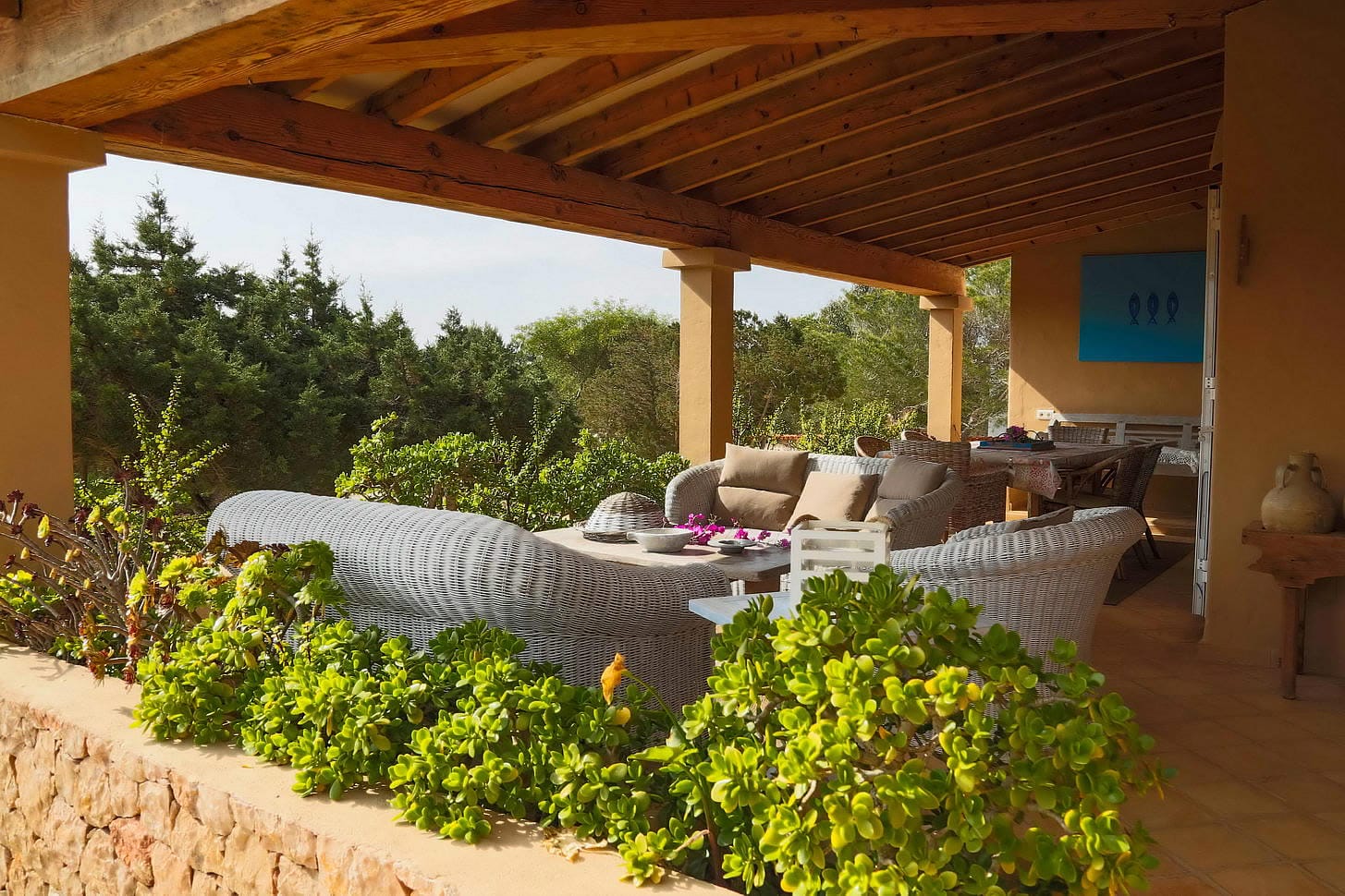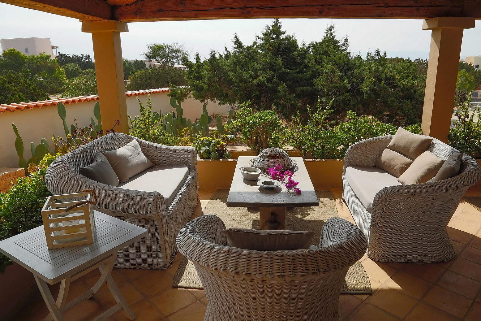 The comfortable terraces that connect to the living room offer shade and views over the typical vegetation of the island of Formentera.