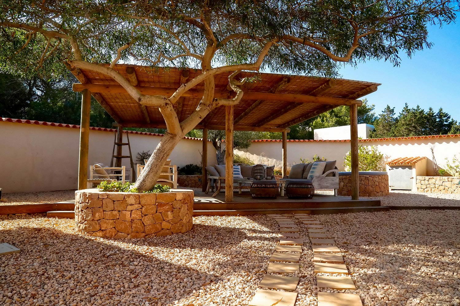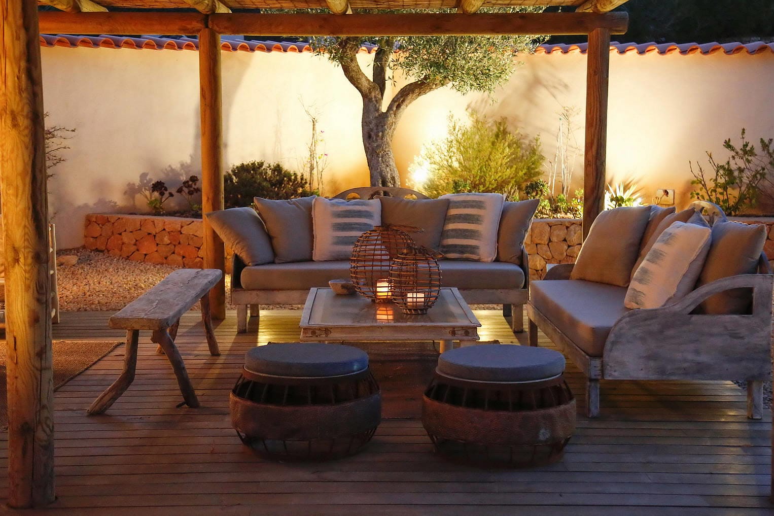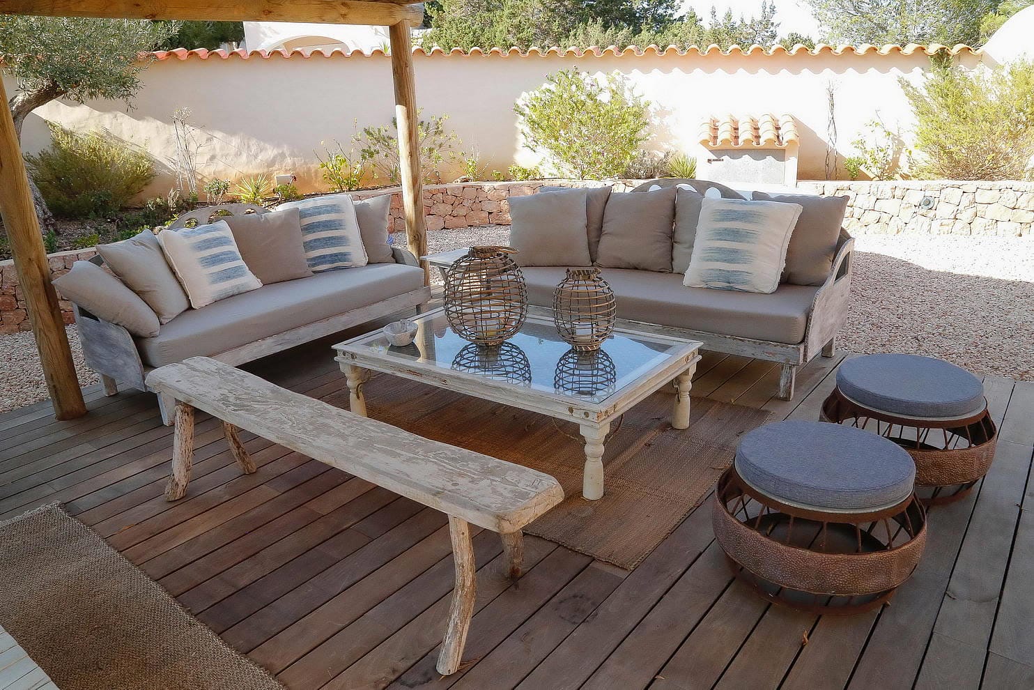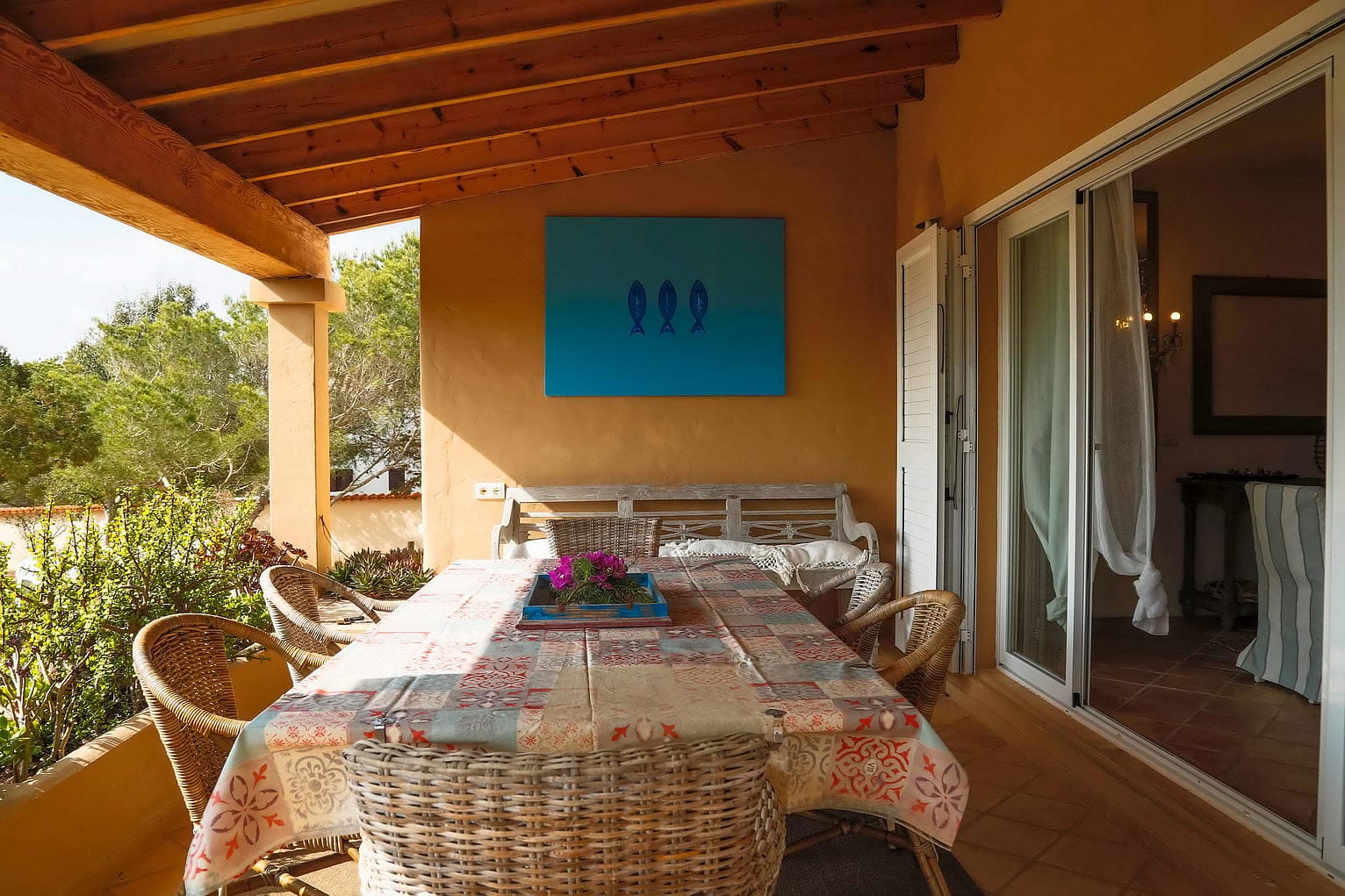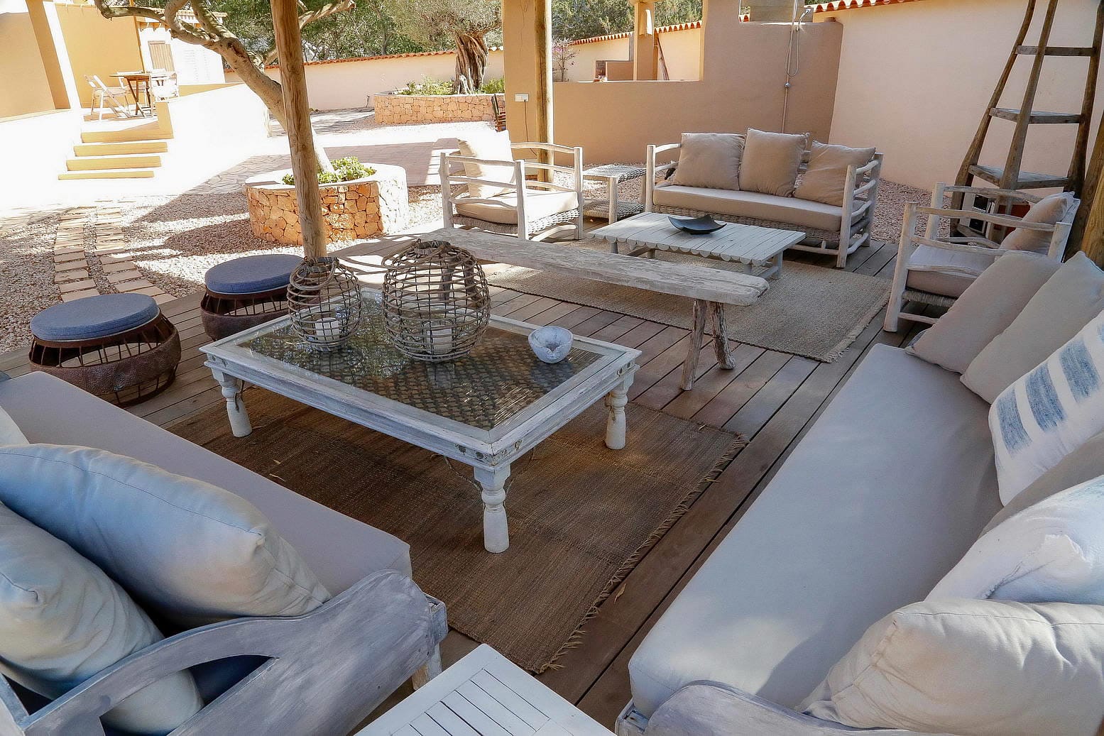 The comfortable terraces that connect to the living room offer shade and views over the typical vegetation of the island of Formentera.