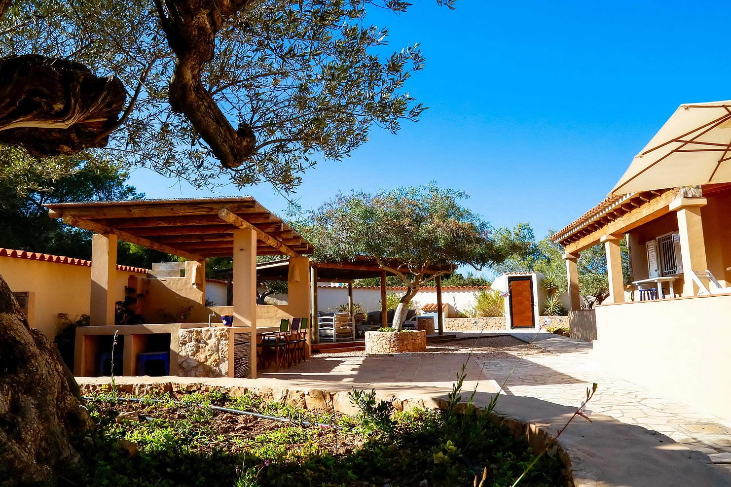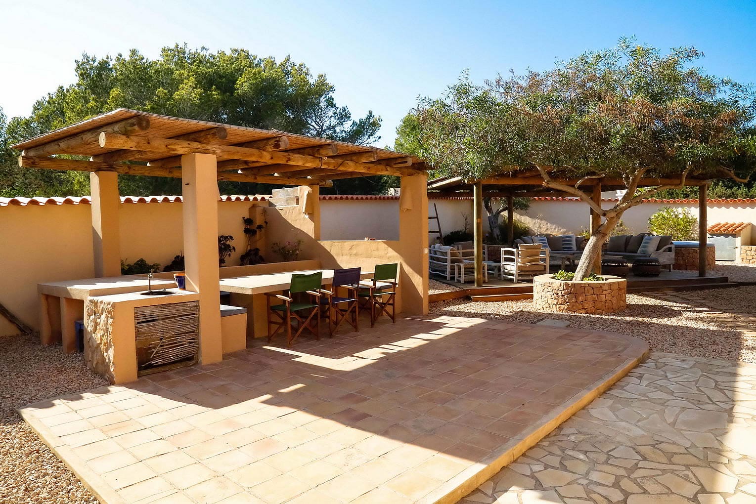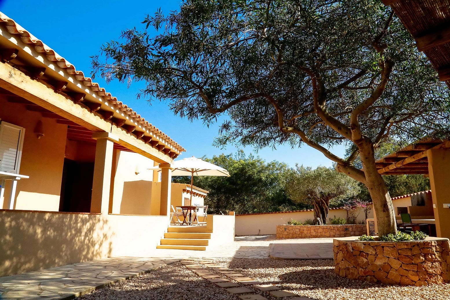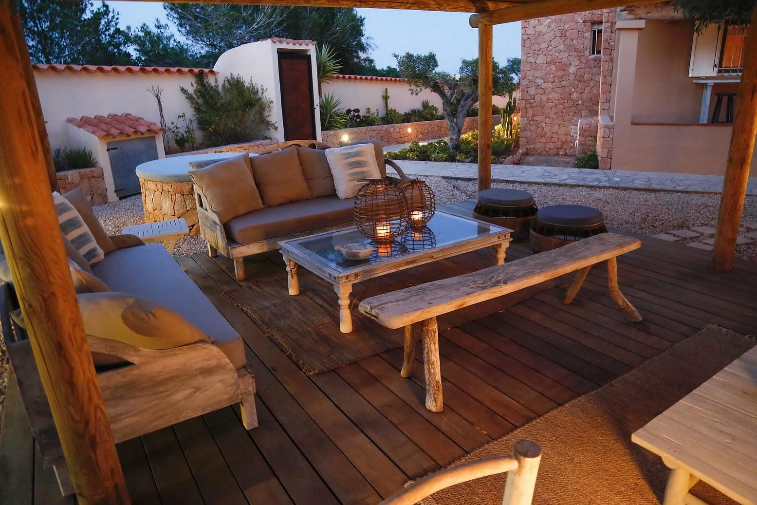 The comfortable terraces that connect to the living room offer shade and views over the typical vegetation of the island of Formentera.