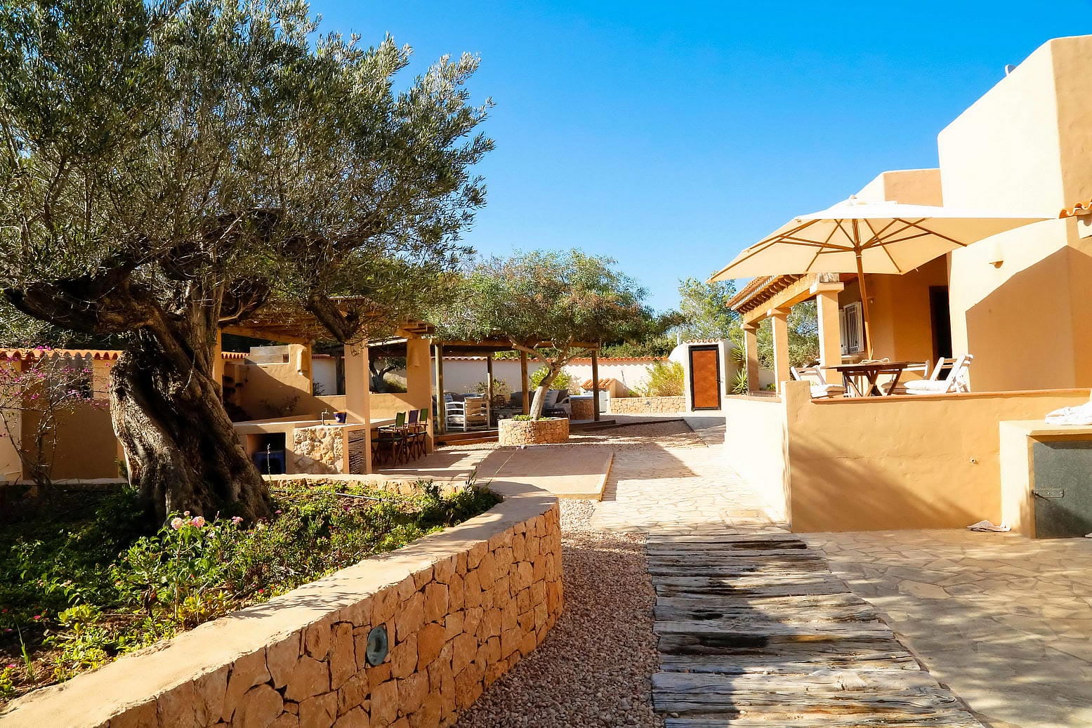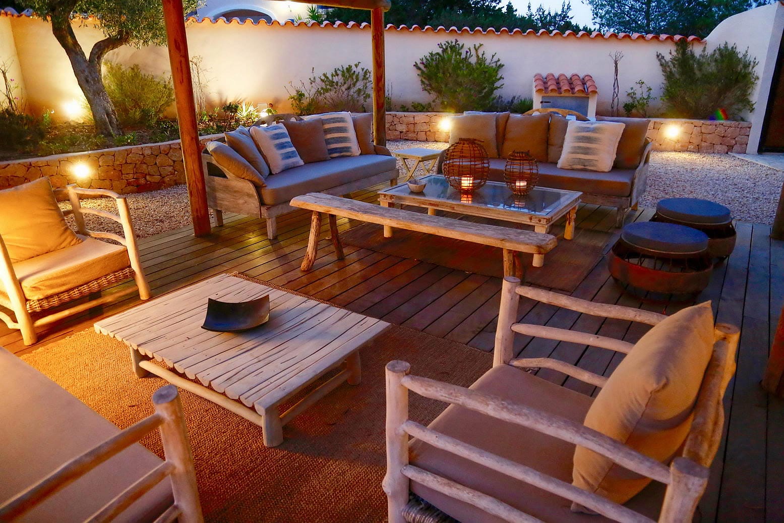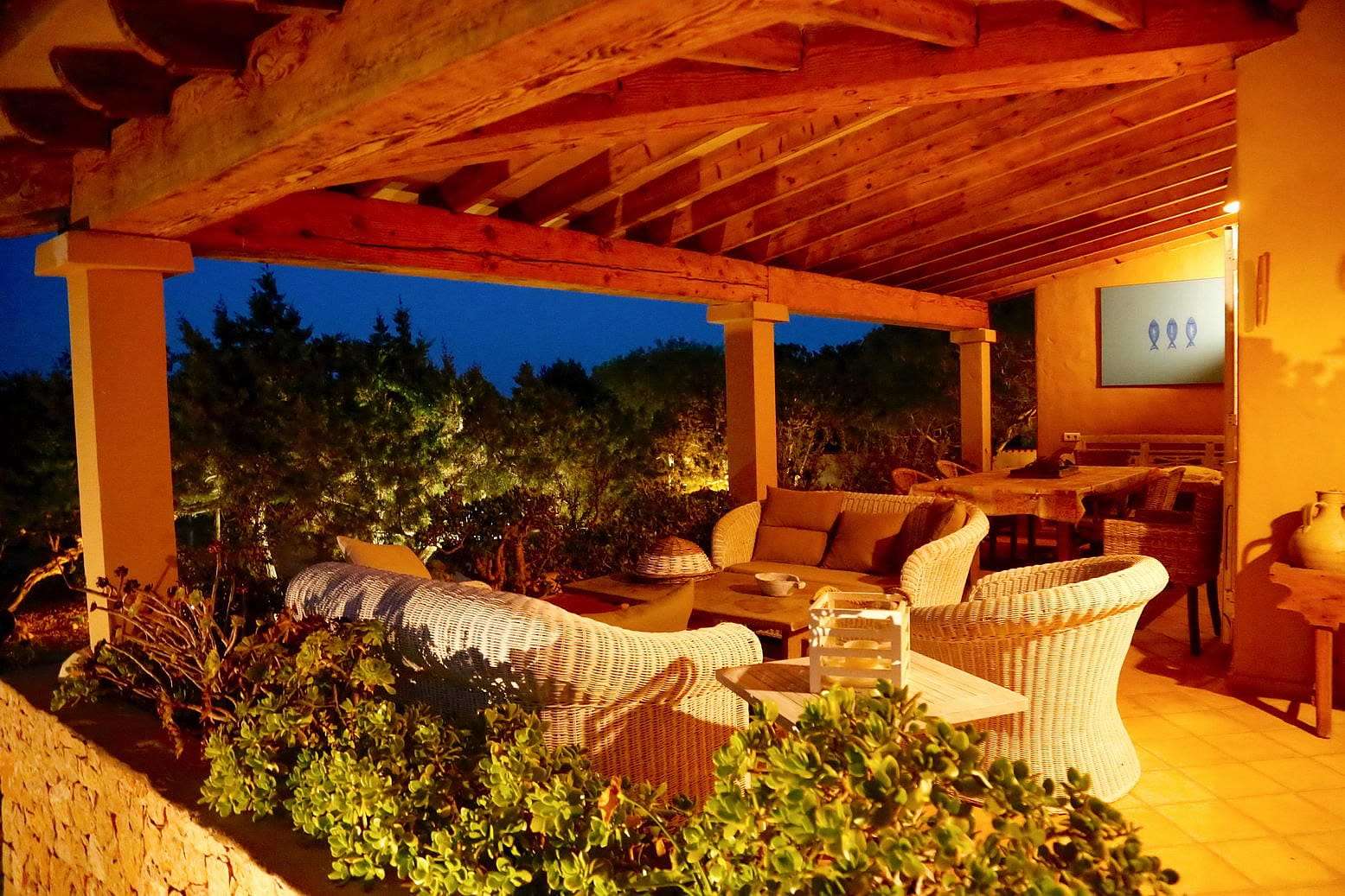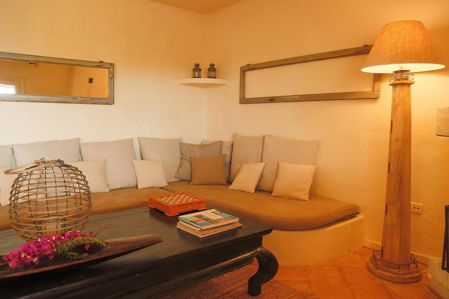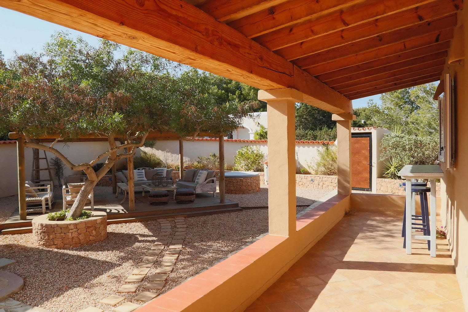 The comfortable terraces that connect to the living room offer shade and views over the typical vegetation of the island of Formentera.