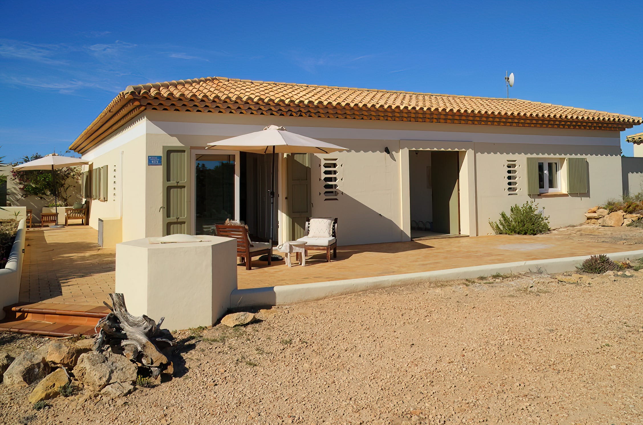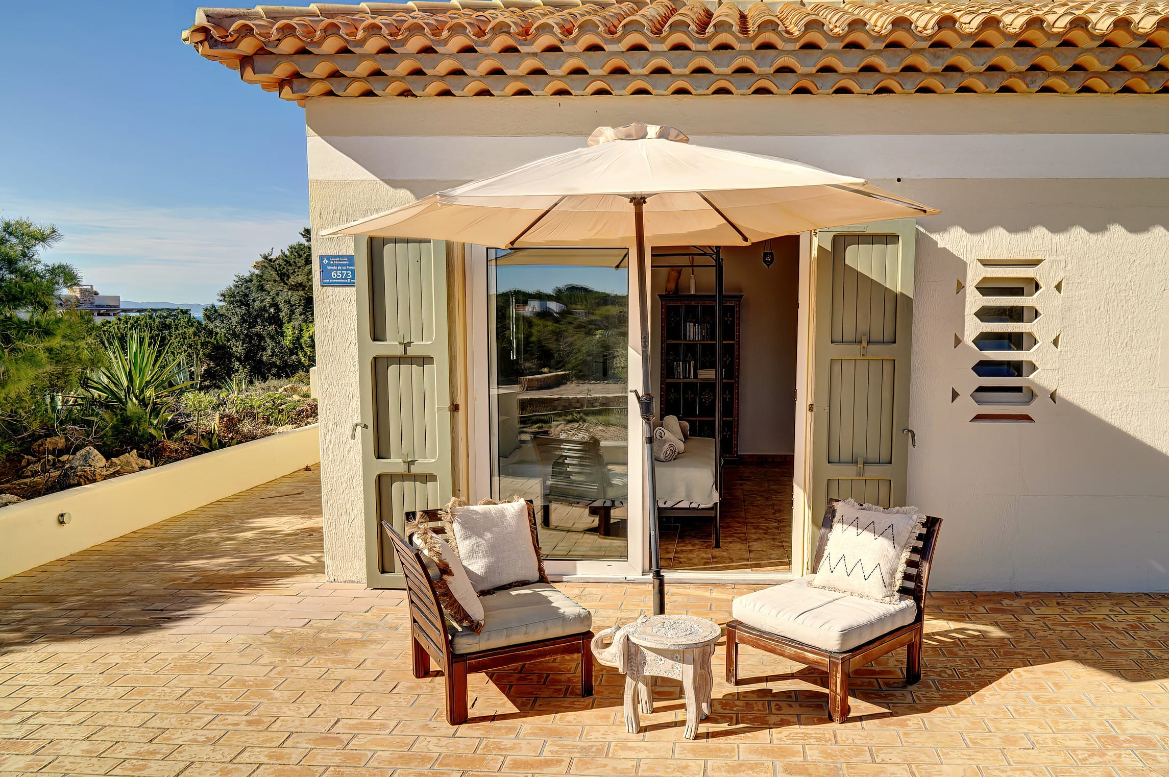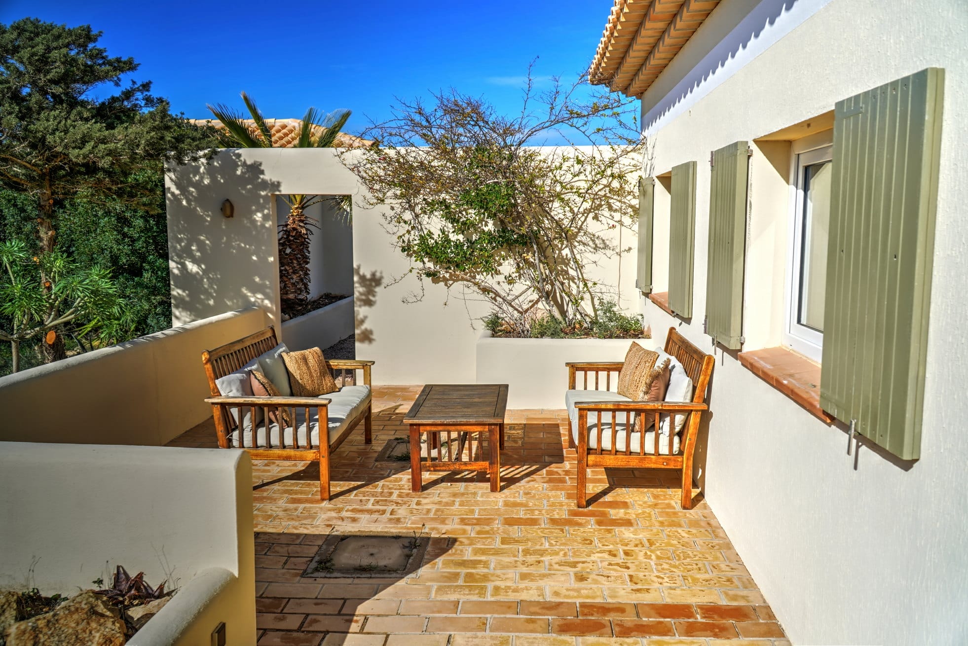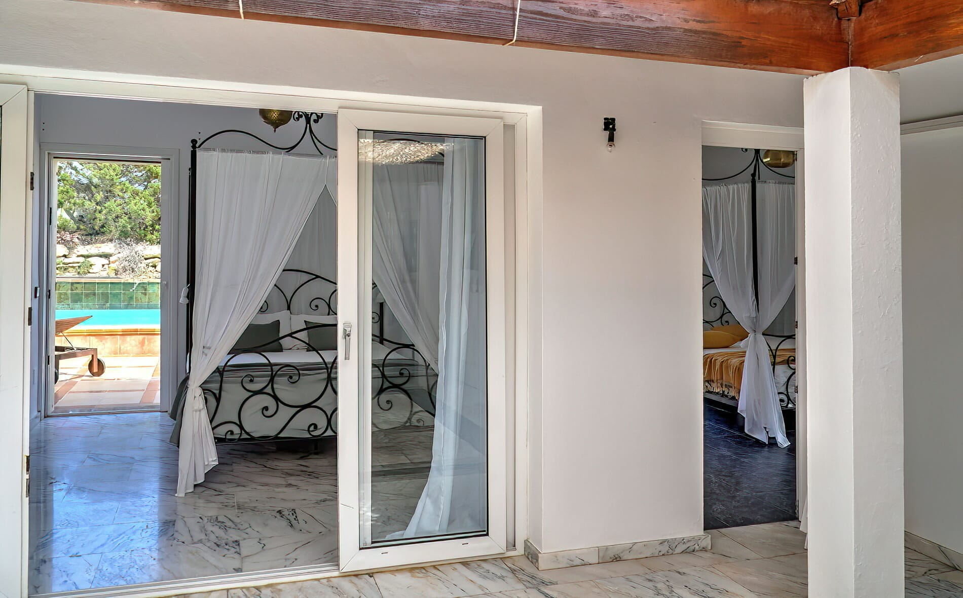 When entering the villa through the front door, we come upon the huge inner terrace that has an open ceiling and serves as the connection point between the bedrooms and the remainder of the home. On the right, there is one en-suite double bedroom with entrance to the front porch and two double bedrooms, each with their own private bathroom and access to the pool terrace. Access to the fourth bedroom, that is also en-suite, is available both from the main entrance and from the living area.