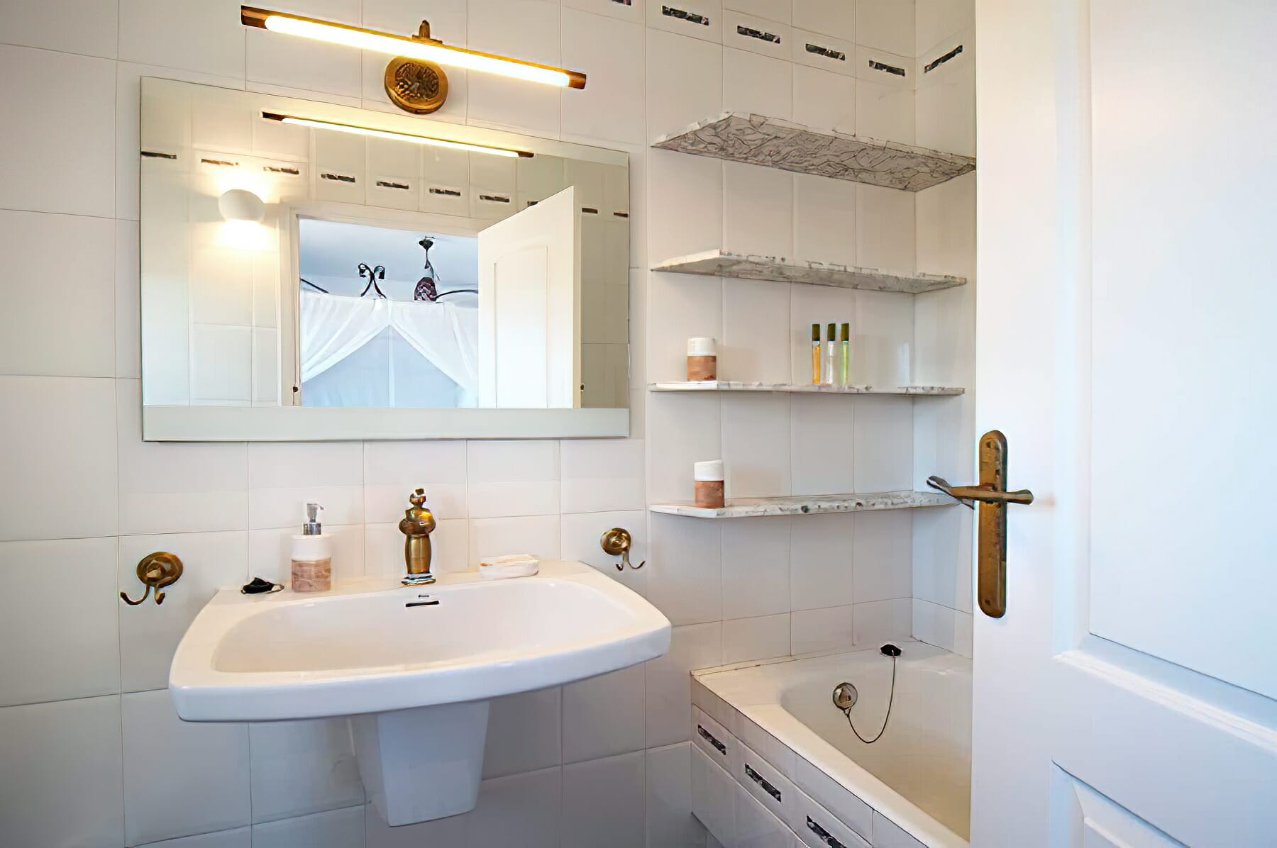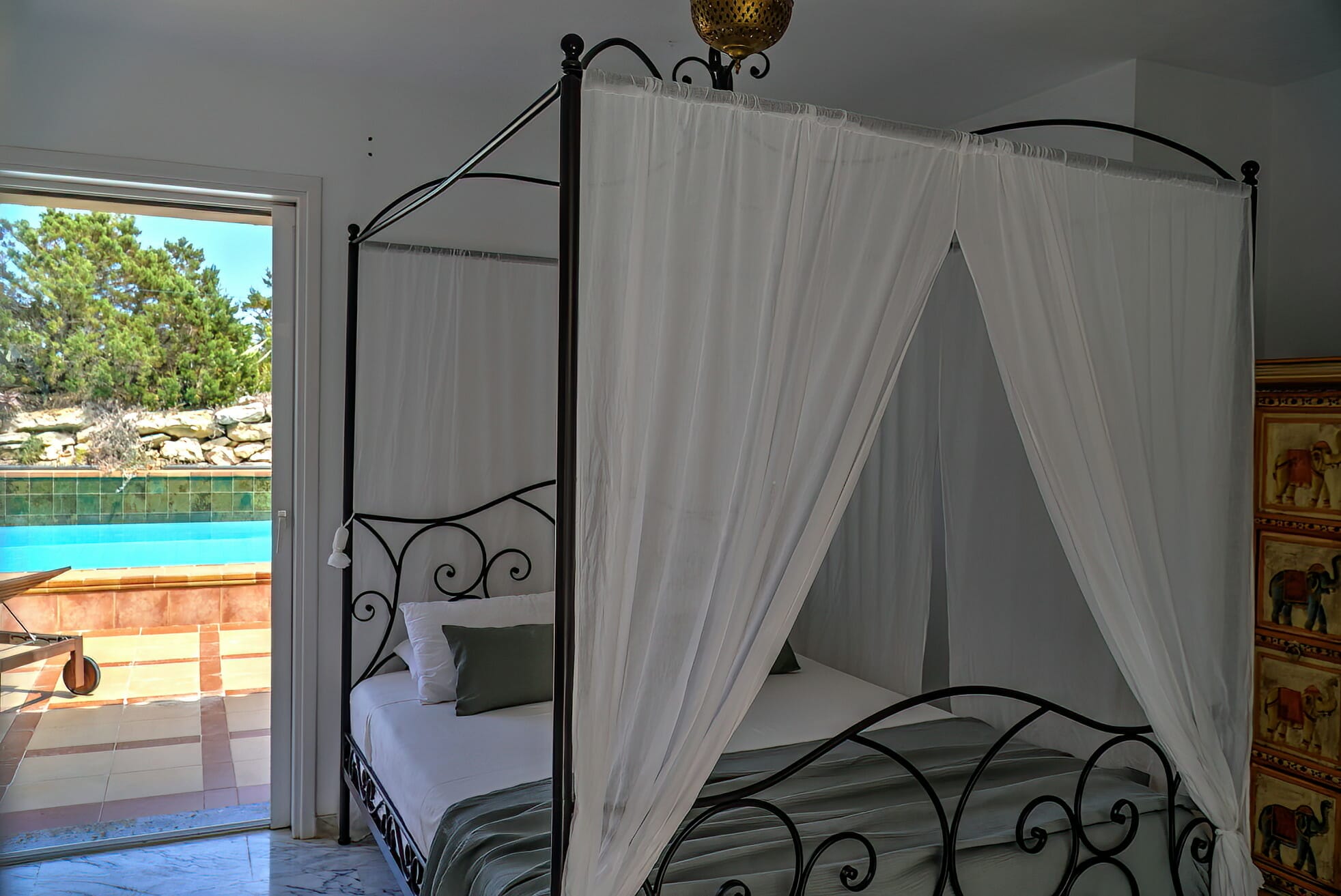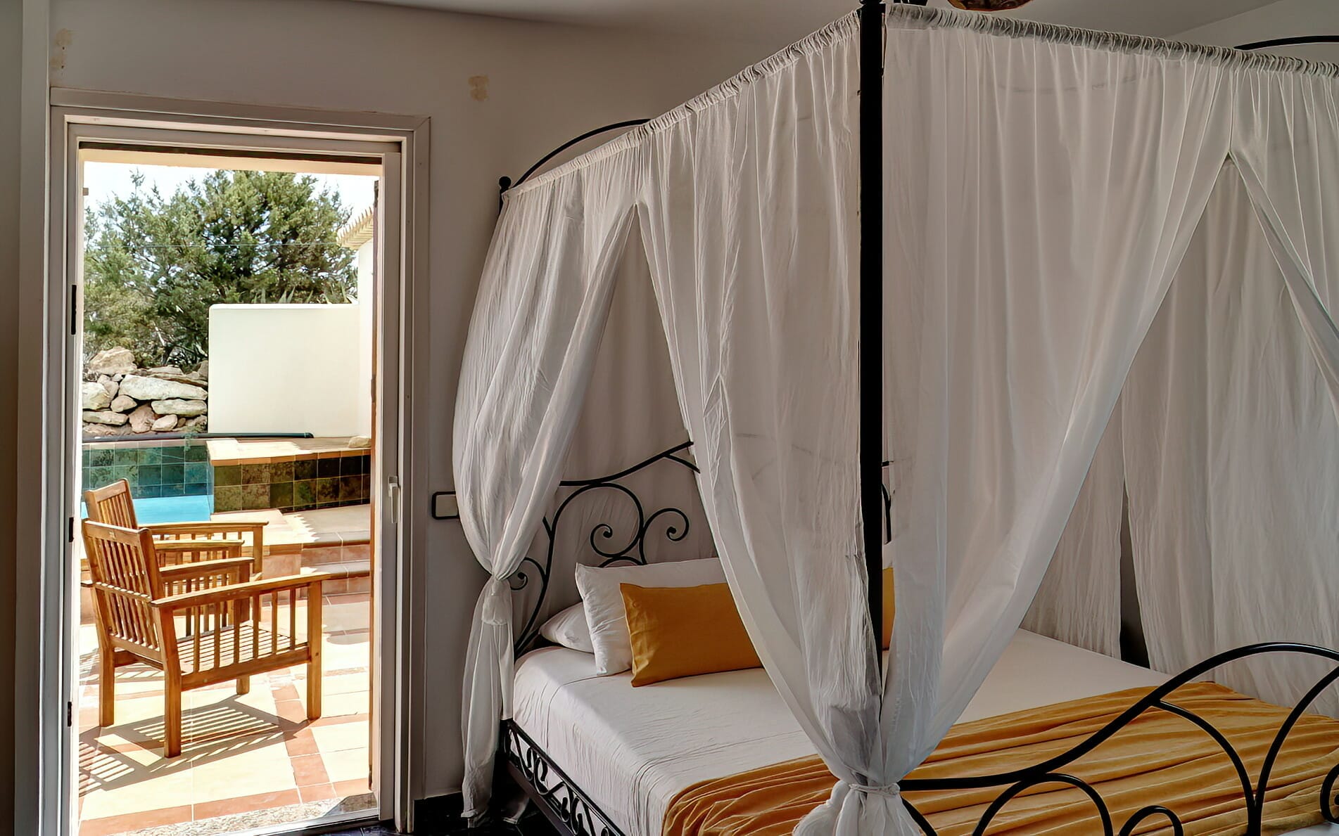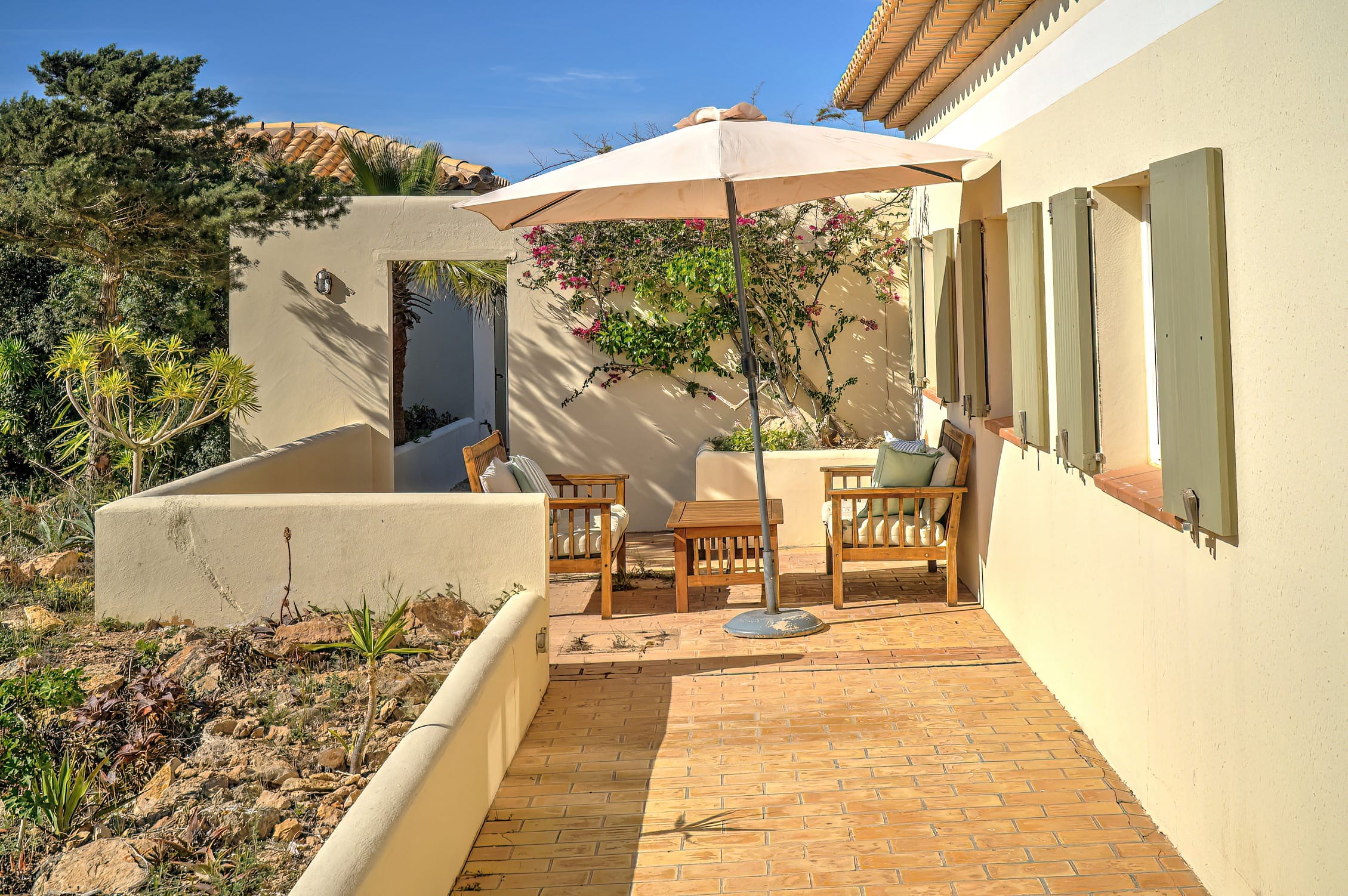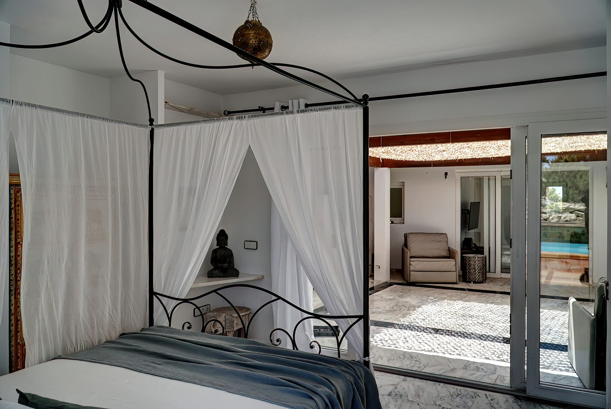When entering the villa through the front door, we come upon the huge inner terrace that has an open ceiling and serves as the connection point between the bedrooms and the remainder of the home. On the right, there is one en-suite double bedroom with entrance to the front porch and two double bedrooms, each with their own private bathroom and access to the pool terrace. Access to the fourth bedroom, that is also en-suite, is available both from the main entrance and from the living area.