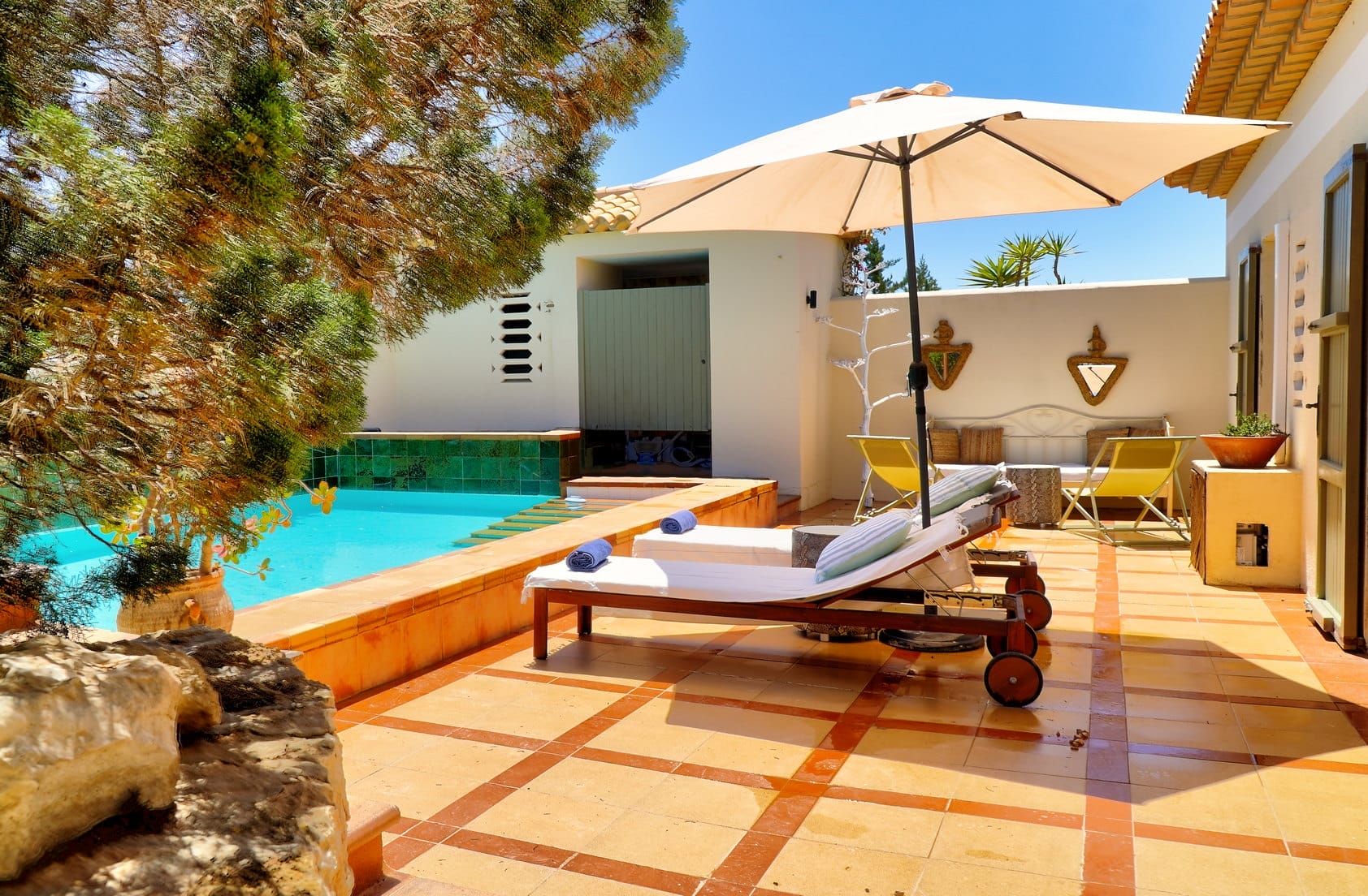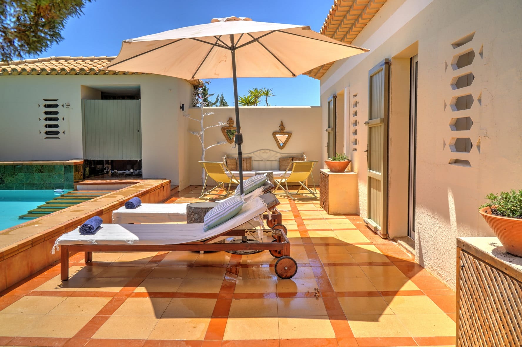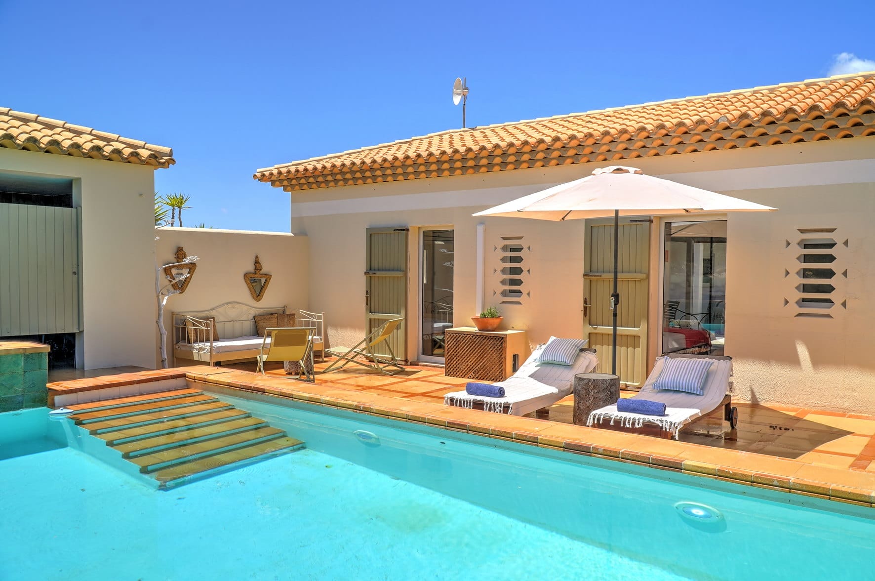 In the exterior, there is a private pool that has a seating area with sunbeds and sofas, and the front porch has a dining table, chairs, and chill-out sofas.