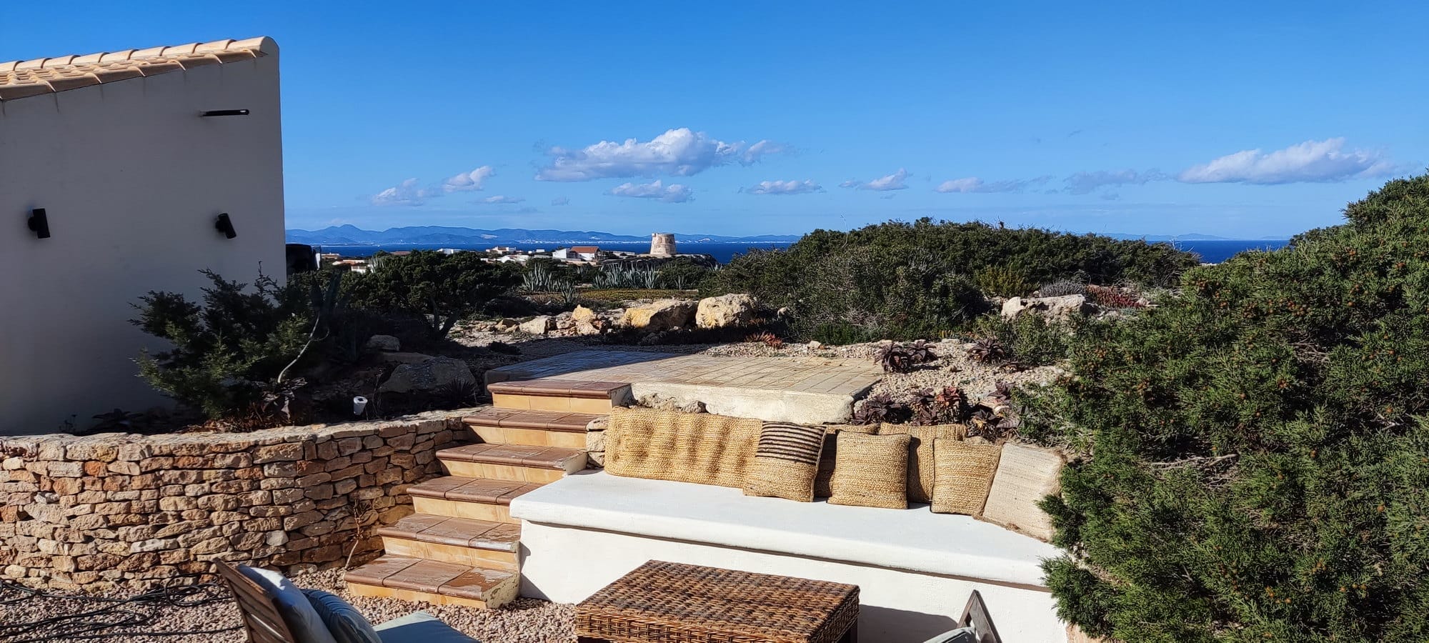Looking for the perfect villa rental in Formentera? This spectacular seaside villa in Punta Prima offers panoramic views of the turquoise Mediterranean waters stretching towards Ibiza. Nestled in an exclusive and peaceful location, this luxury Formentera villa is the ideal retreat for families or groups of friends looking to experience the island in style.