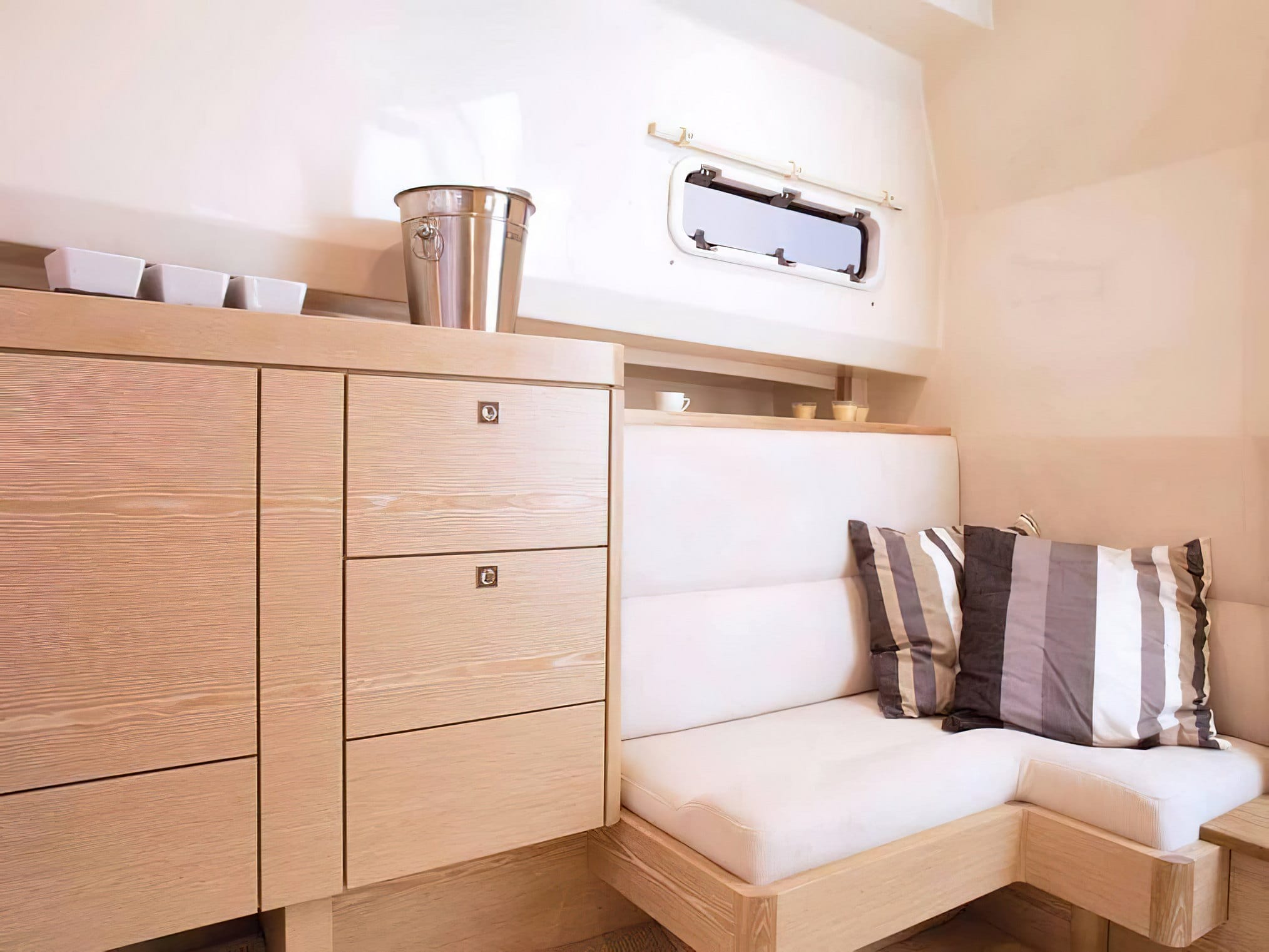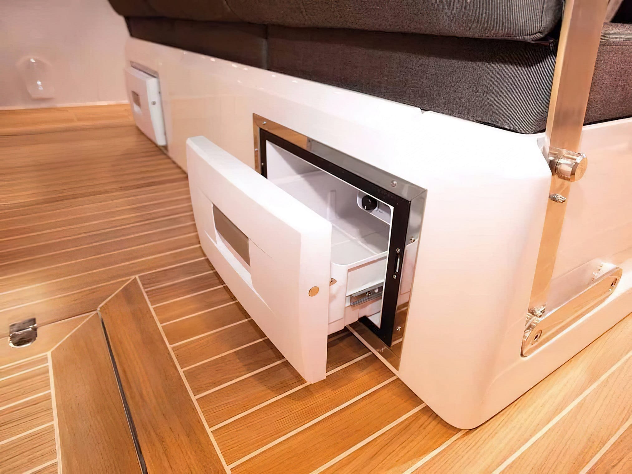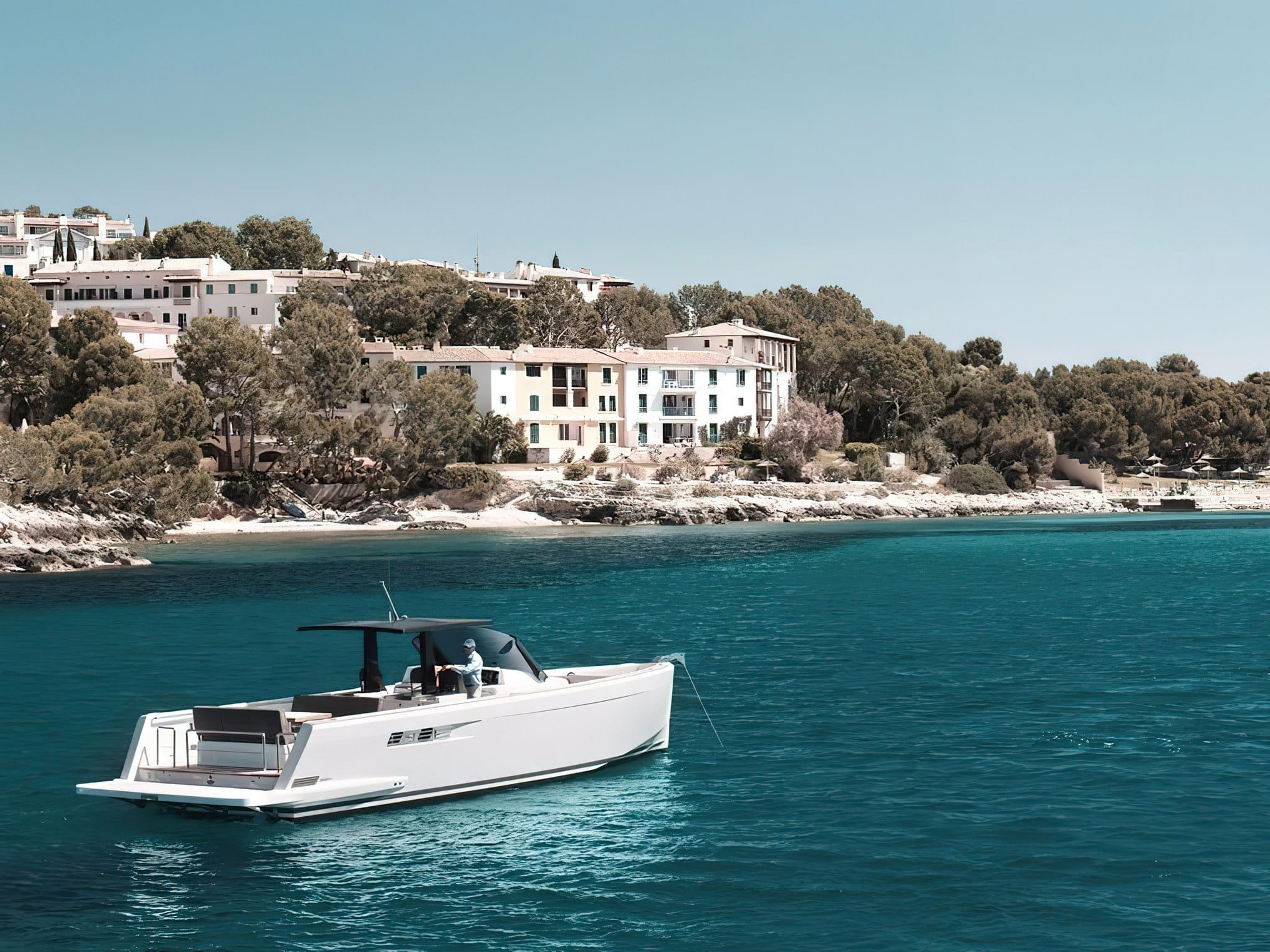 The Fjord 40 is a masterpiece of design and functionality, offering an exceptional sailing experience with its unique hull shape that glides effortlessly above the water. This innovative design minimizes sea spray, ensuring a remarkably dry and smooth ride, even at high speeds. The yacht’s large and tall windscreen provides superior protection for the helm seats, galley, and forward cockpit table chairs, making every journey comfortable and enjoyable. Safety and ease of movement are at the heart of the Fjord 40’s design. The spacious walk-around deck allows guests of all ages to navigate from bow to stern with confidence, while the open layout around the center console and cockpit table ensures effortless movement on board. The robust T-Top provides shade and protection, covering the helm station and three foldable seats that offer the flexibility of both standing and seated driving positions. Beneath the T-Top, the well-equipped galley is strategically positioned for convenience, allowing you to prepare refreshments while remaining engaged with your guests. Entertainment and relaxation are seamlessly integrated into the Fjord 40. The generous workspace next to the cockpit table makes it easy to craft cocktails or snacks without missing a moment of the action. With just the touch of a button, the cockpit table transforms into a spacious sunbed, while both forward and aft sunbathing areas come with optional micro-perforated Biminis, providing much-needed shade on warm summer days. Combining cutting-edge performance, luxurious comfort, and unparalleled practicality, the Fjord 40 is the ultimate yacht for those who seek a stylish and versatile experience on the water.