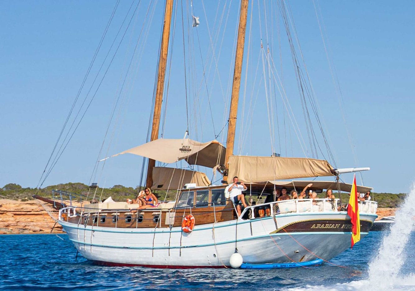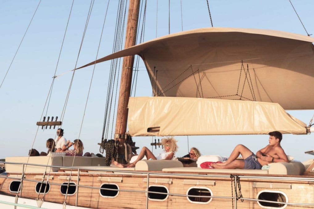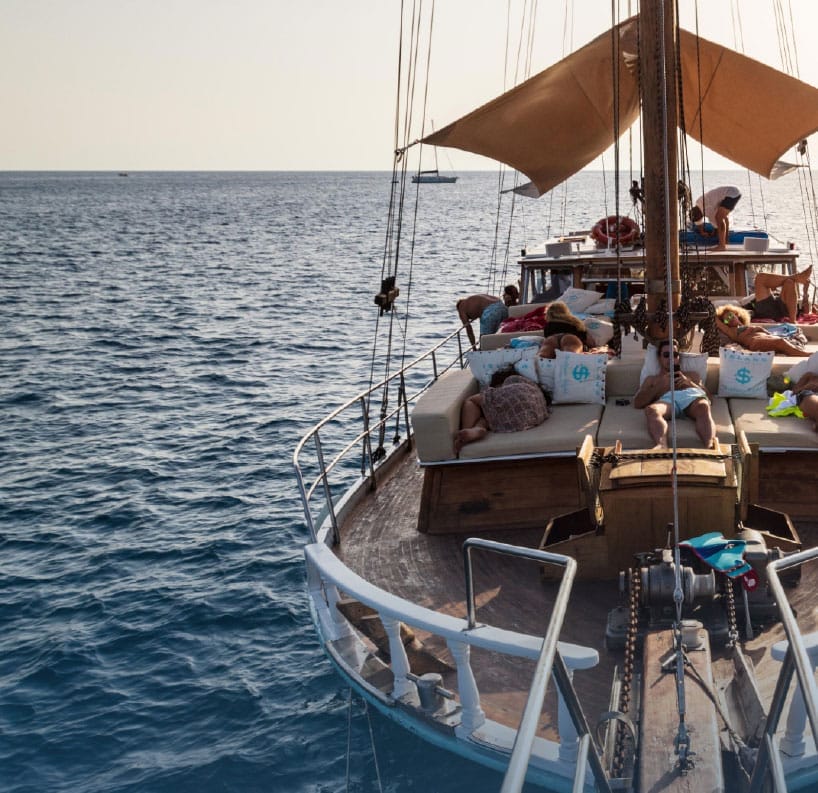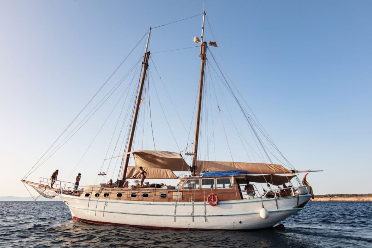 Chartering this gulet is the perfect way to enjoy an unforgettable day at sea, exploring the beautiful coastline of Ibiza and Formentera. With a capacity of up to 25 people, it offers spacious areas to lounge, sunbathe, and have a great time with friends or family. A typical day on board begins at the port of La Savina, in Formentera. From there, we set sail towards the island of Espalmador, enjoying stunning views of Illetas beach along the way. Once anchored, the sailor will take you to the island on the dinghy—an almost untouched paradise in the heart of the Mediterranean. Back on board, a delicious lunch awaits you, served right on the gulet. After a refreshing swim and a moment to relax, we continue our journey towards Cala Saona, sailing and soaking in the beauty of the coastline. In Cala Saona, with its crystal-clear waters, you can enjoy snorkeling or simply take one last swim before heading back to the port at sunset. Get in touch with us through the form above. Don’t wait—charter your gulet in Ibiza and Formentera now and live a truly unique experience at sea.
